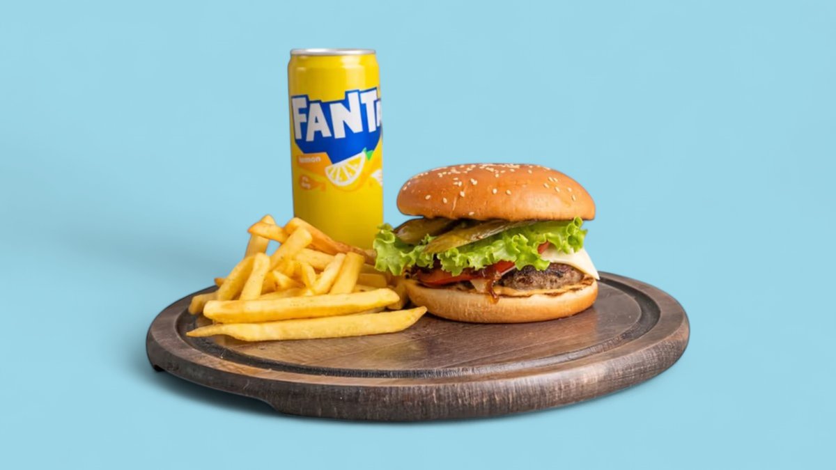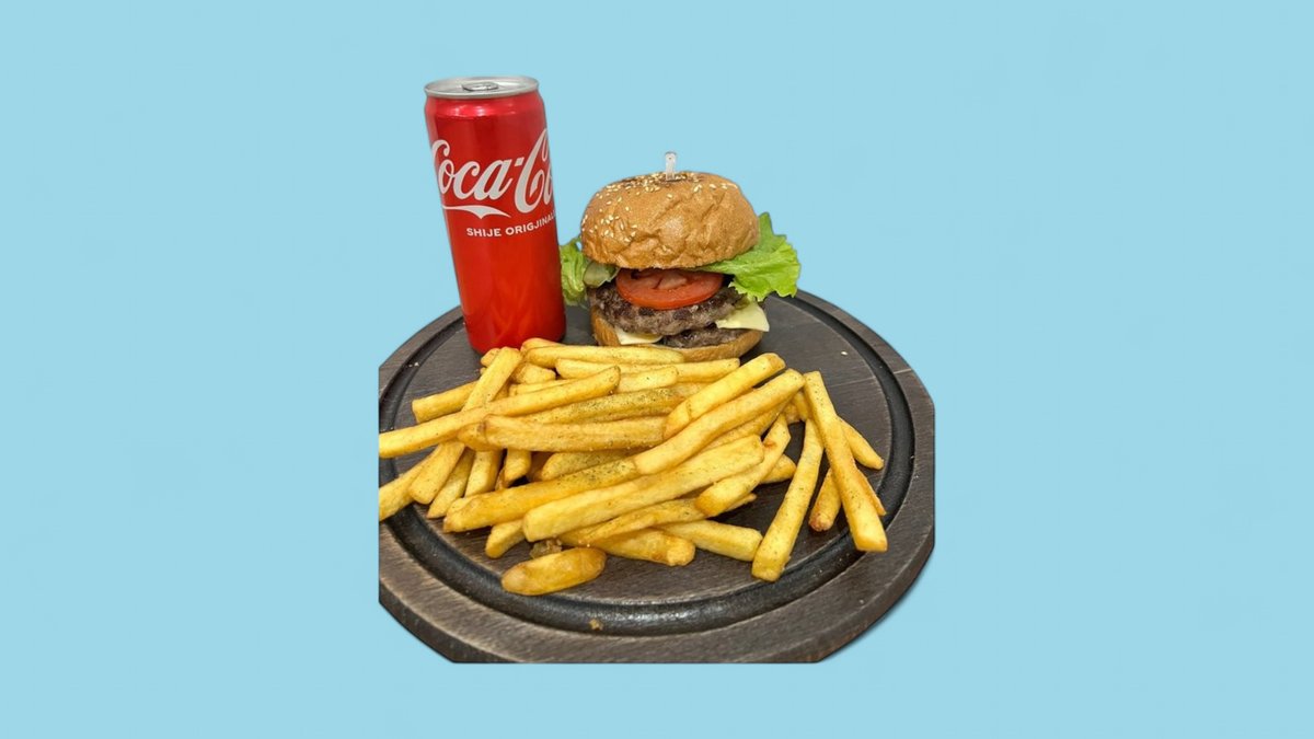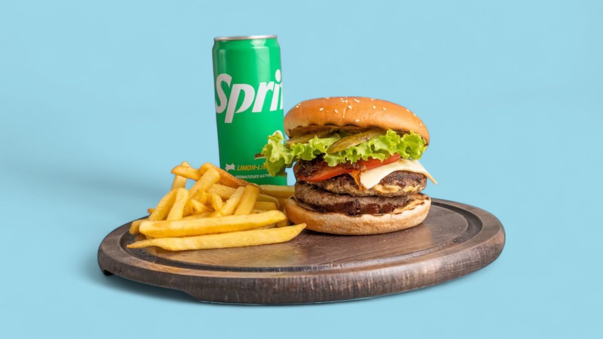 Double beef burger, 2 wings or 1 drumstick, chips, drink