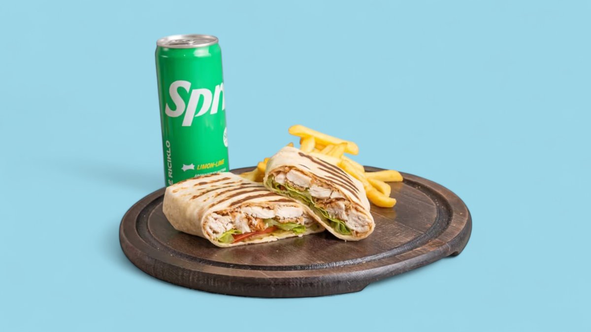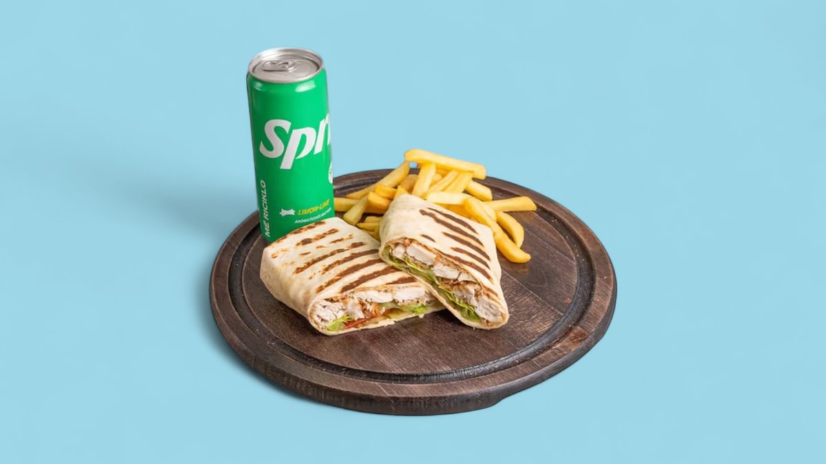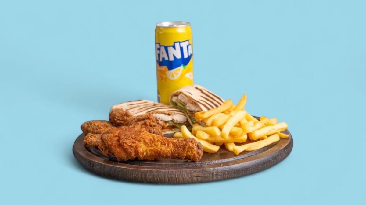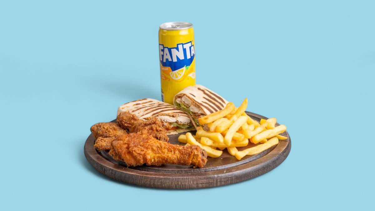 Fillet wrap, 2 wings or 1 drumstick, chips, drink