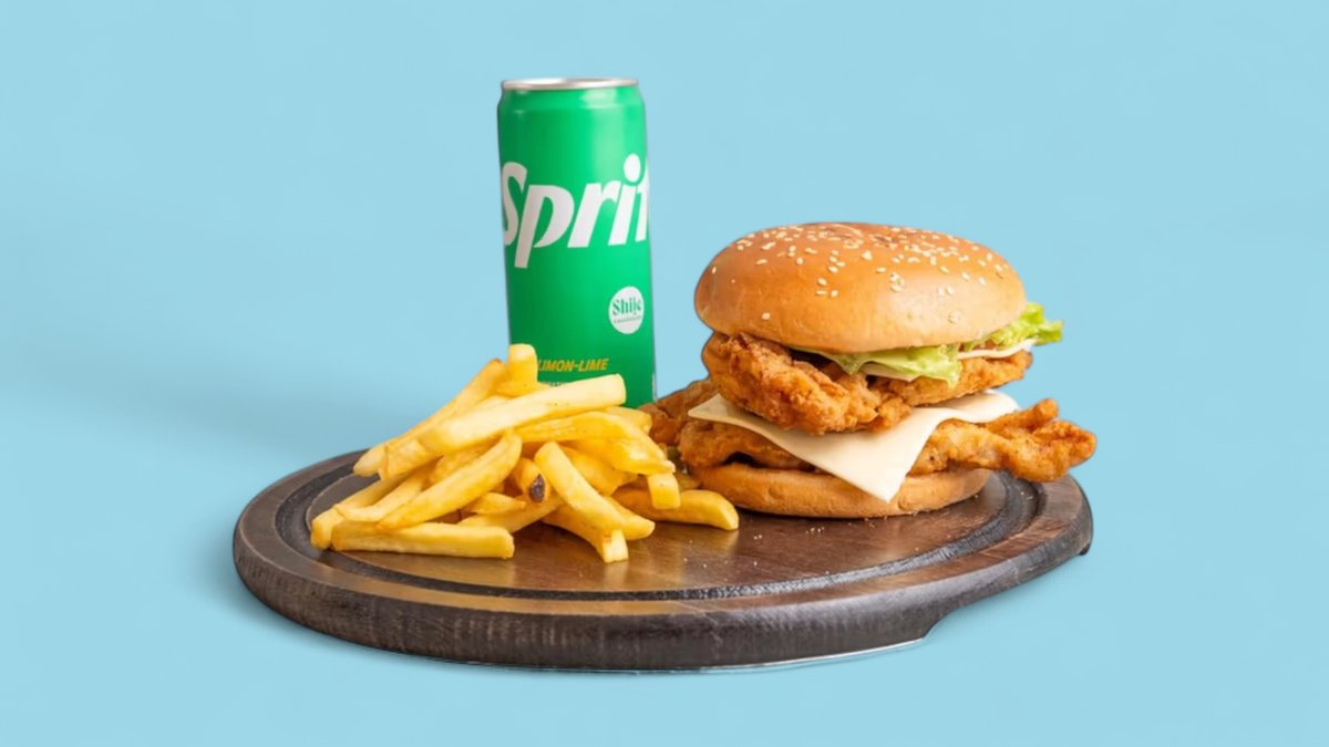 Spicy fillet burger, 2 wings or 1 drumstick, chips, drink