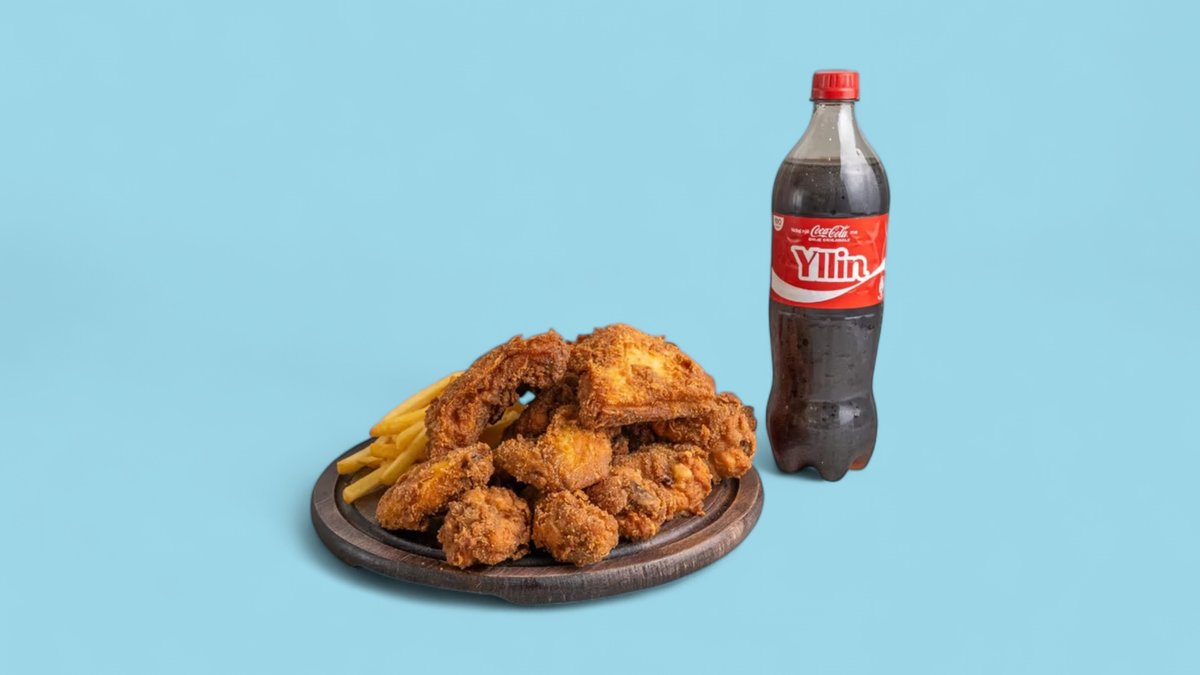 6 Pieces of chicken, 12 wings, 3 potatoes, 1 family coca cola