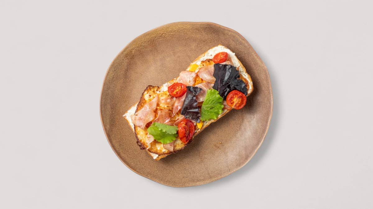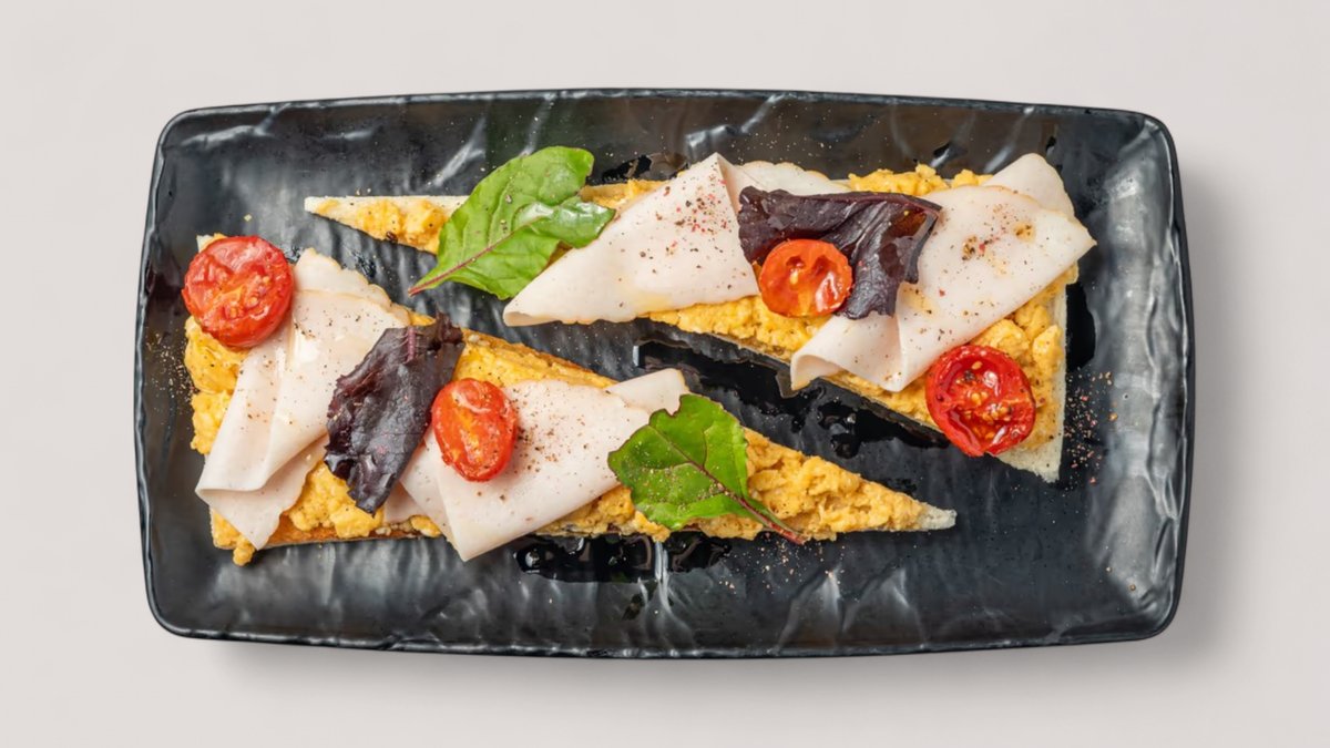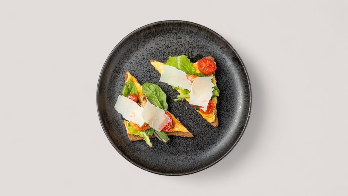 Bukë tramezzini, proshutë gjeli, vezë omletë, krem djathi