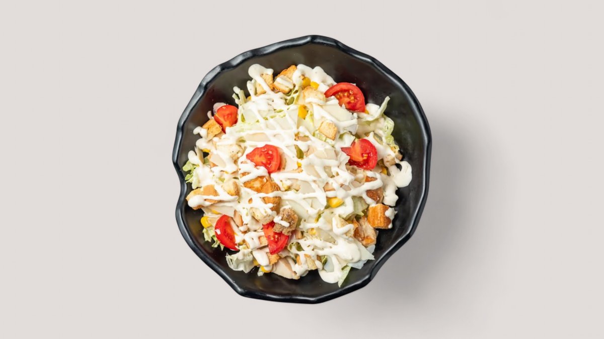 Sallatë ajsberg, grana, salcë cezar, fileto pule, misër, kubeti, pomodorini