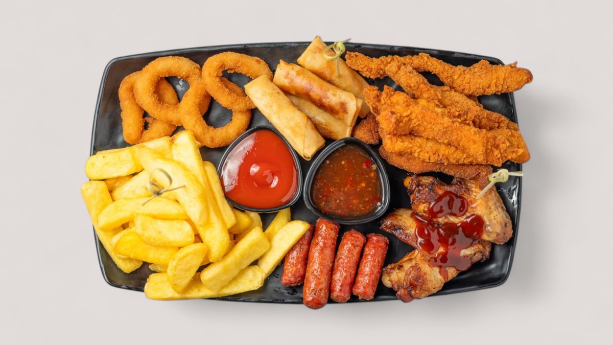 Chicken finger, sausage, potatoes, chicken wings, sauce, onion rings, spring rolls