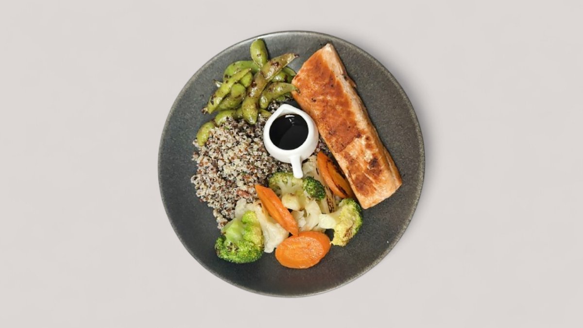 Salmon, quinoa, brokoli, karrota, pomodorini, majdanoz, salce soja, edamame
