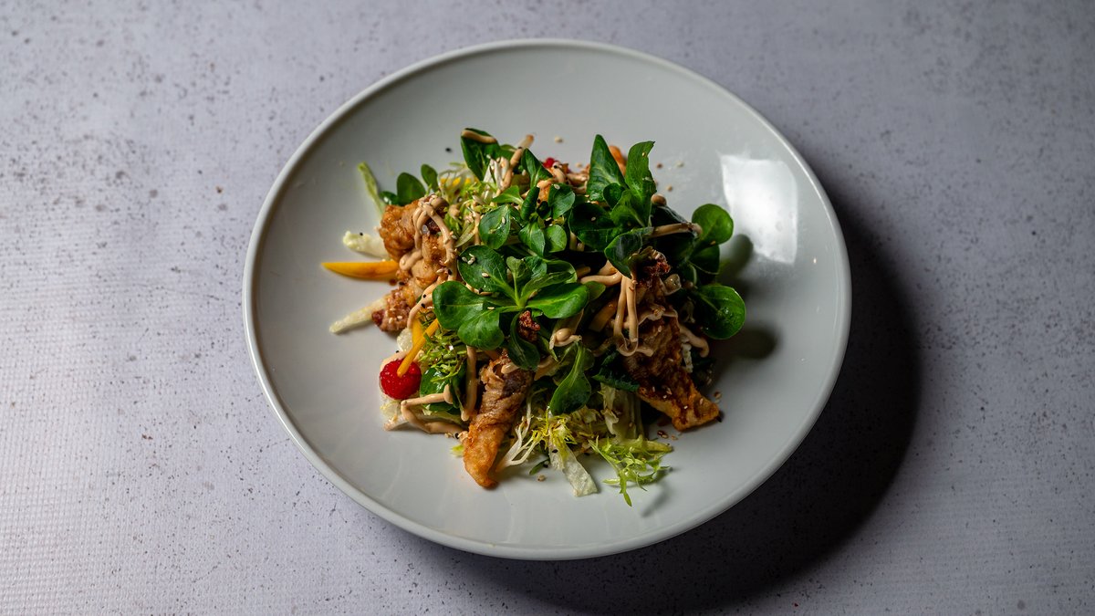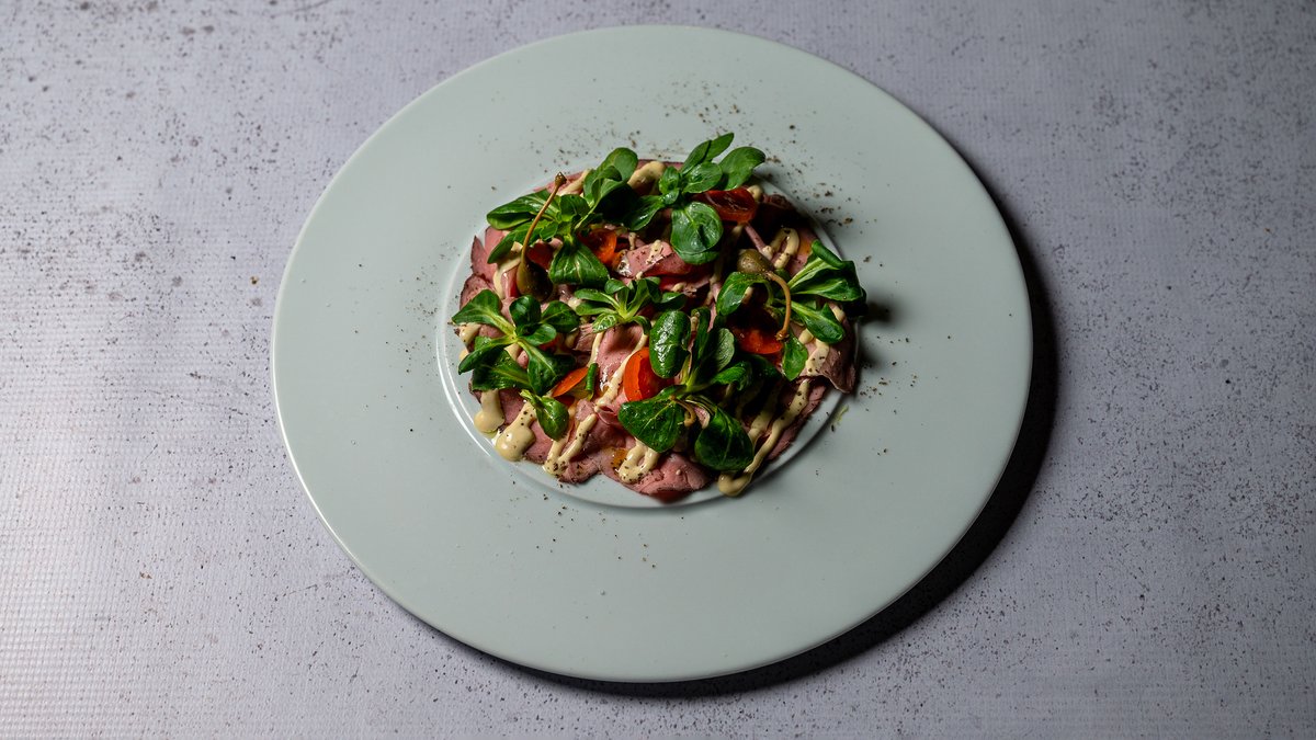 Mish vici i fresket i marinuar dhe gatuar ngadale, salce kremoze me kaperi, sallate valeriana, parmixhano