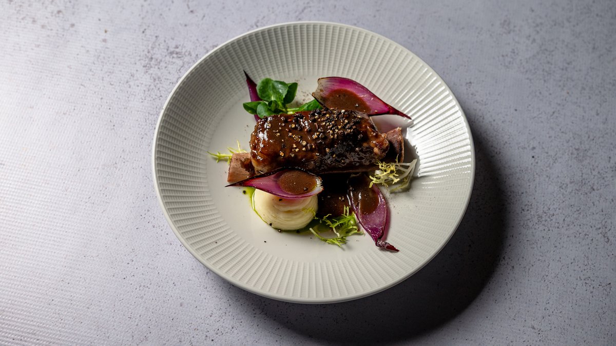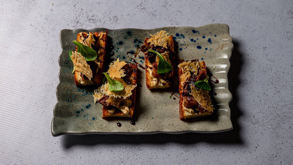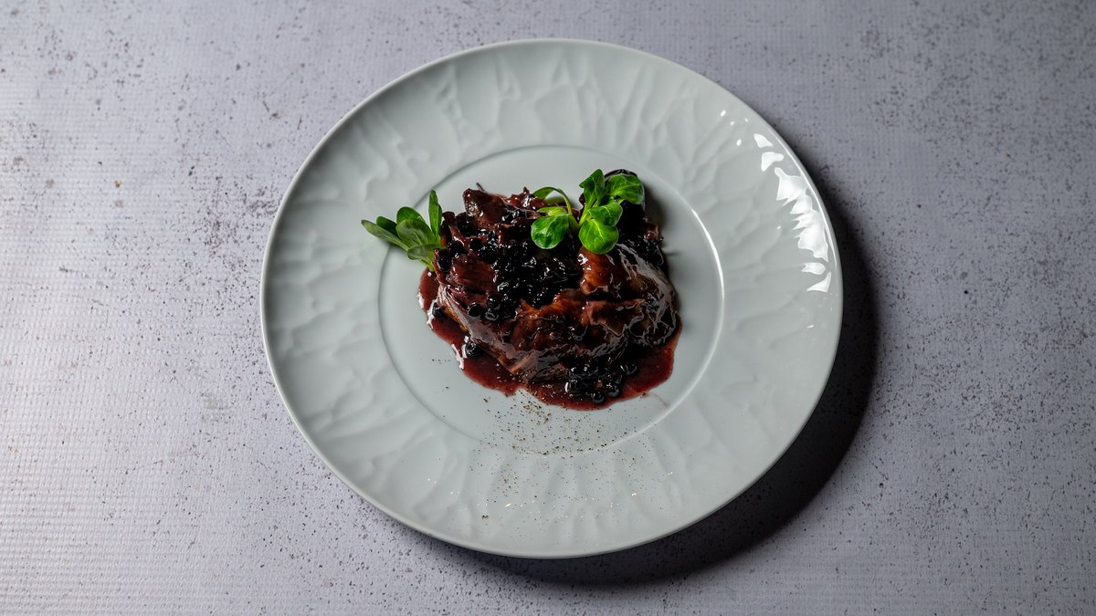 Bukë brioshi e thekur me mish brinje të gatuar ngadalë, krem djathi tartuf dhe reduktim vere