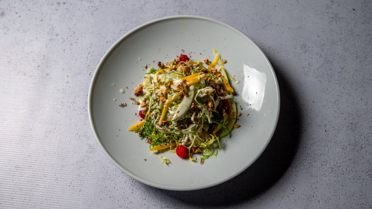 Kombinim ekzotik me mango të freskët, sallatë jeshile, arra ose fara dhe salcë me djath gorgonxola