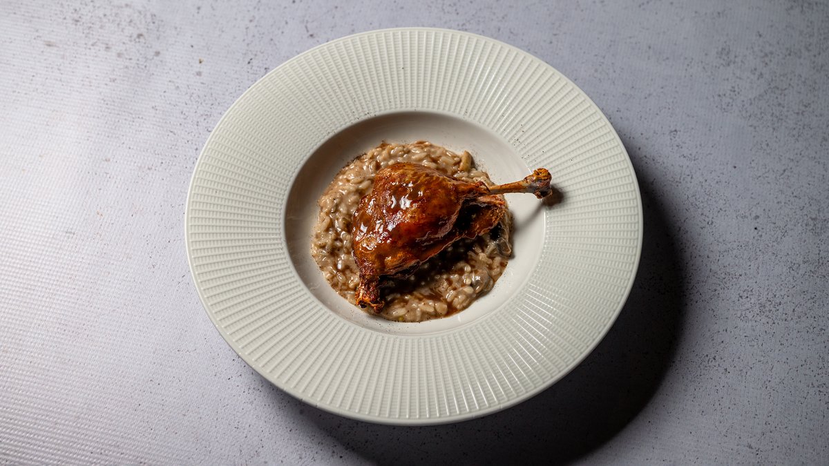Rizoto kremoz me kerpurdha porchini, djath parmixhano & kofshe rose e gatuar ne temperatur te ulur