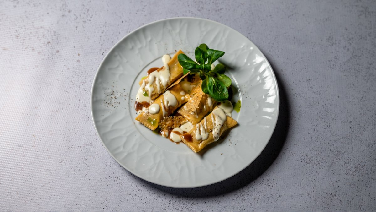 Agnolotti të mbushura me mish brinje, me fondu djathi parmixhano & demiglas