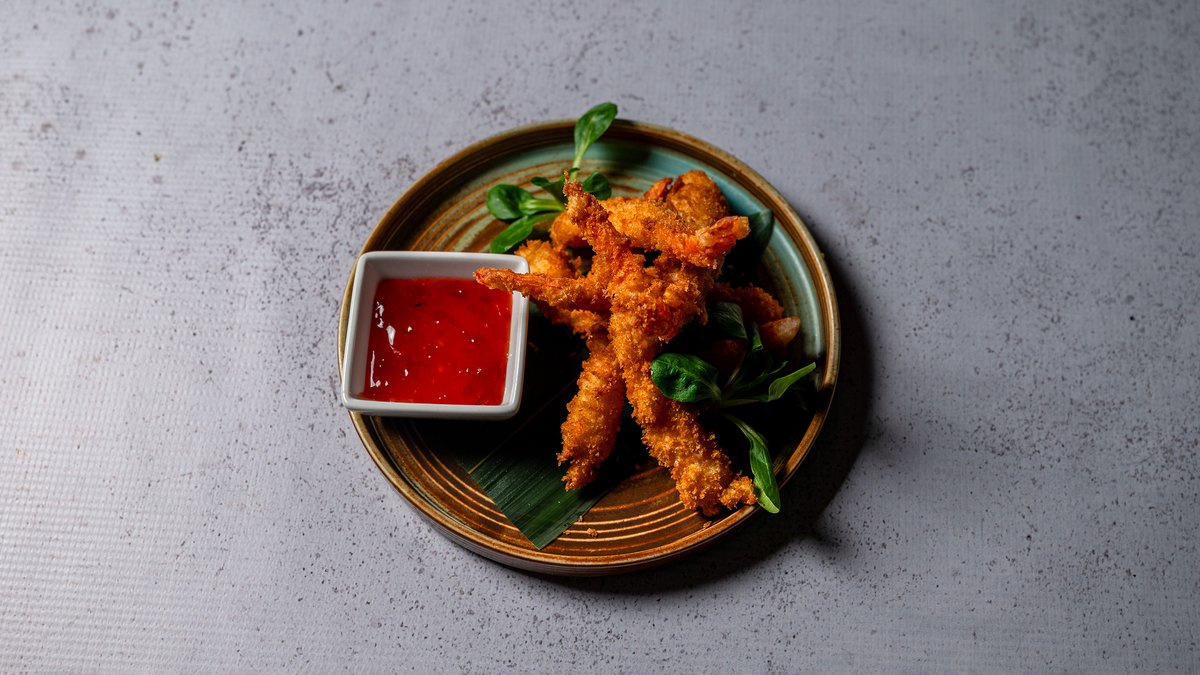 Karkaleca të skuqur në brumë të lehtë tempura, shërbyer me sweet chily