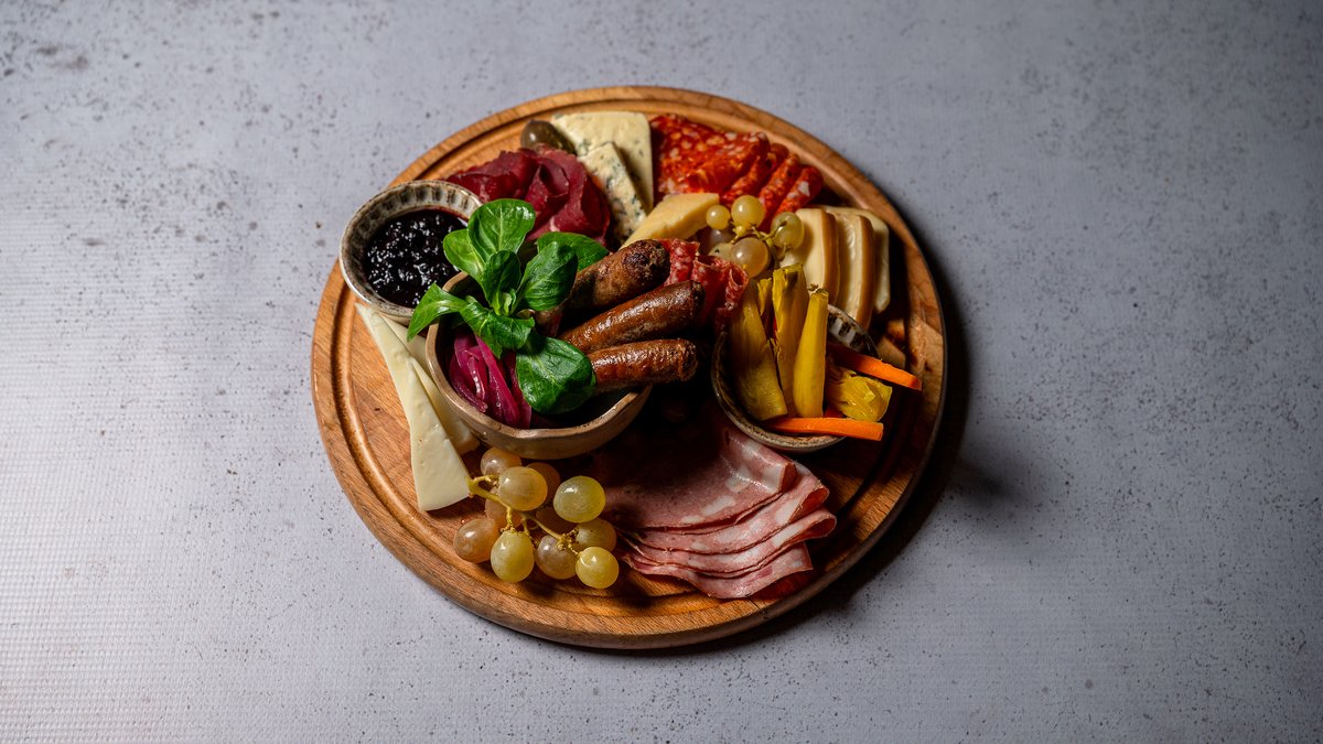 Pjatance me përzgjedhje proshutash djathrash dhe salcice derri eger, buke te thekur dhe turshi