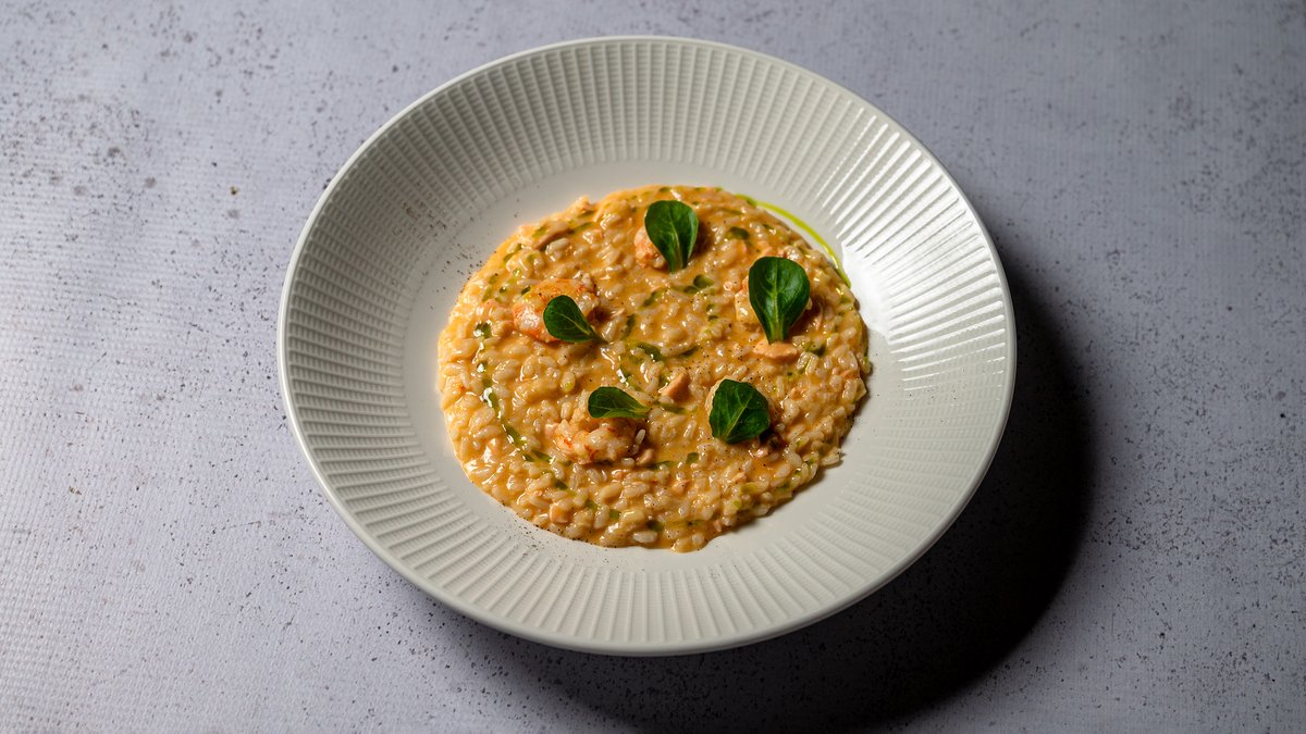 Rizoto me salmon dhe karkaleca në teksturë kremoze