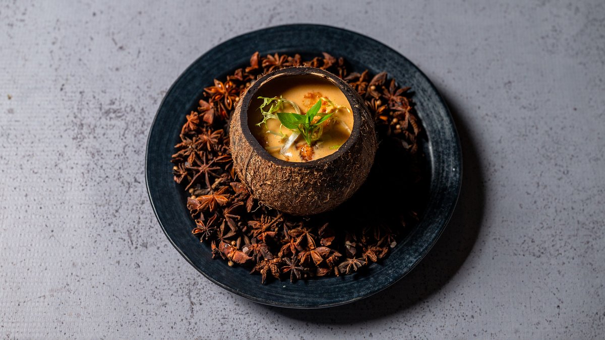 Supë me salmon & karkalec, perime, qumesht arra cocosi