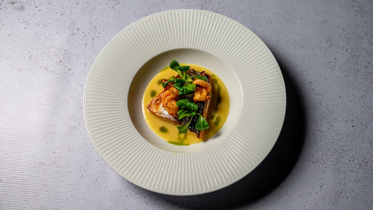 Levrek i freskët i pjekur në zgarë ose furrë me karkalec te marinuar, shafran & sweet chily, salc agrumesh