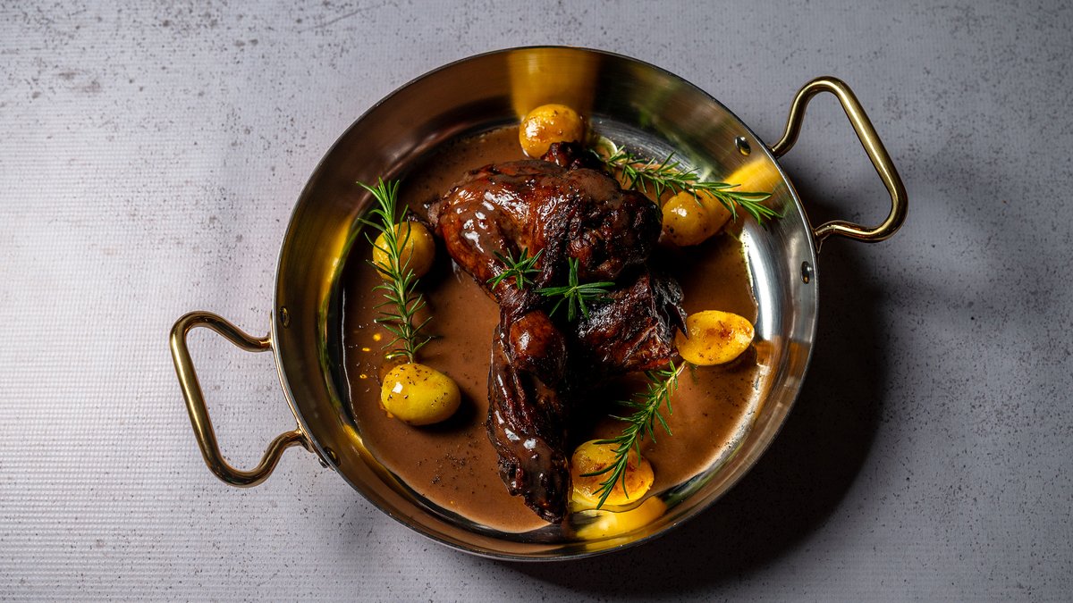 Shpatull qengji e gatuar ngadalë me eksrakt shege shoqeruar me patate bebi dhe kerkpudha te egra