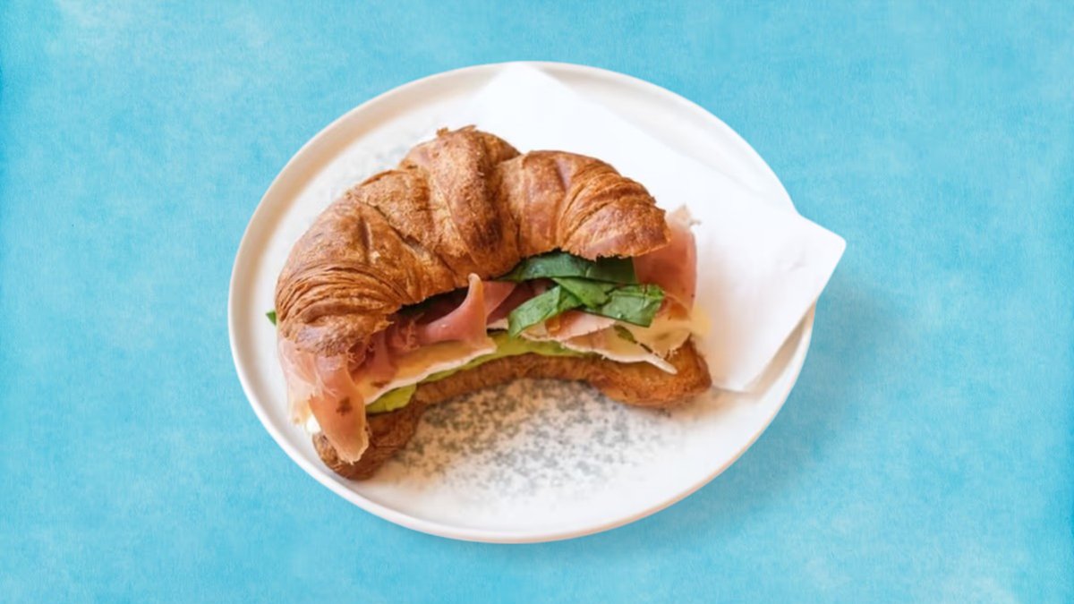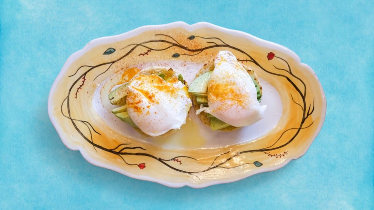 English muffins, vezë poche, avocado, vaj ulliri, mente