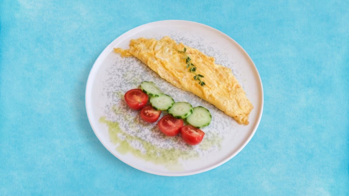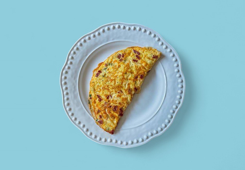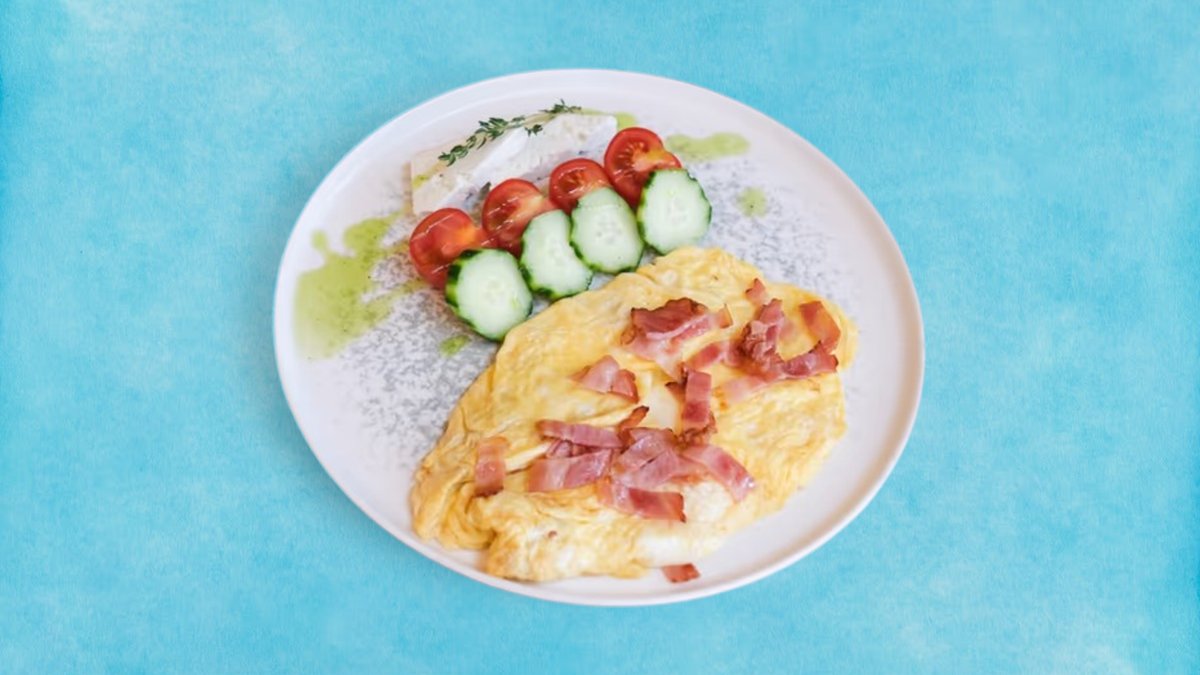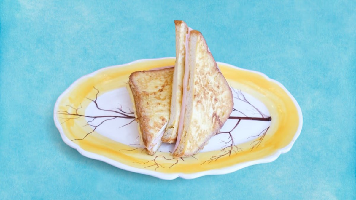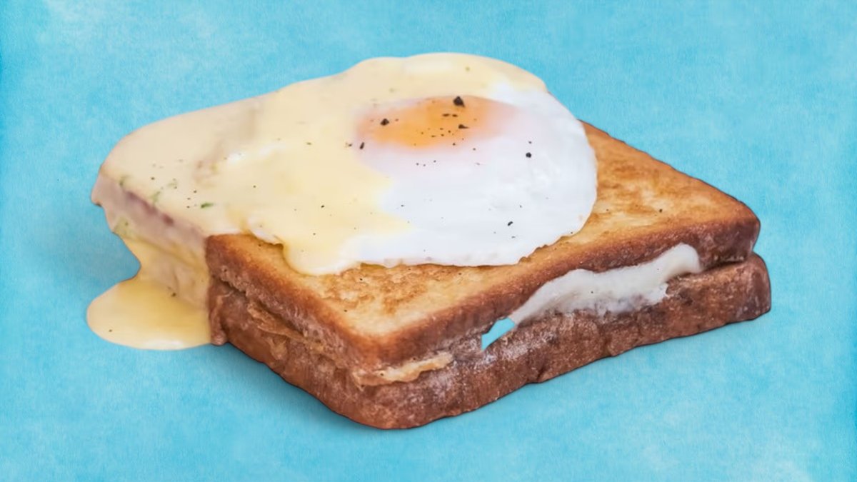 Bukë tosti, vezë, djathë edamer, proshutë cotto, vezë sy, salcë hollandeze