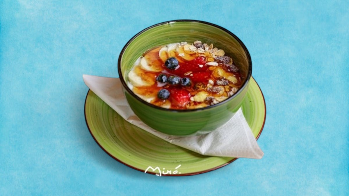 Qumësht, kos, banana, boronicë, fara chia, kanellë, mjaltë