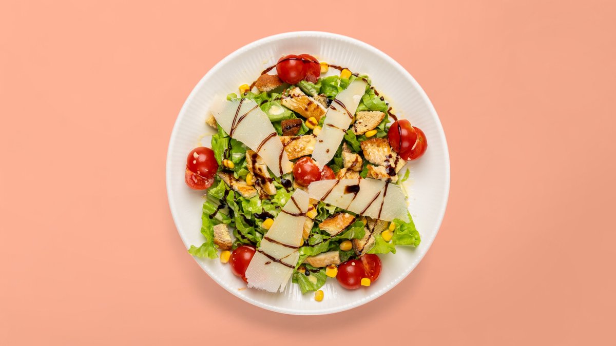Sallatë jeshile, bukë e thekur, fileto pule, salcë cesar, grana