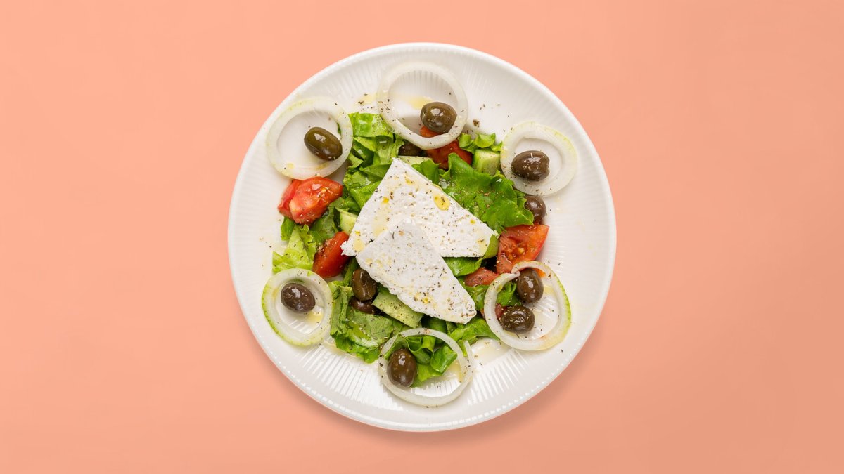 Sallatë jeshile, djathë, ullinj, qepë, kastravec, domate