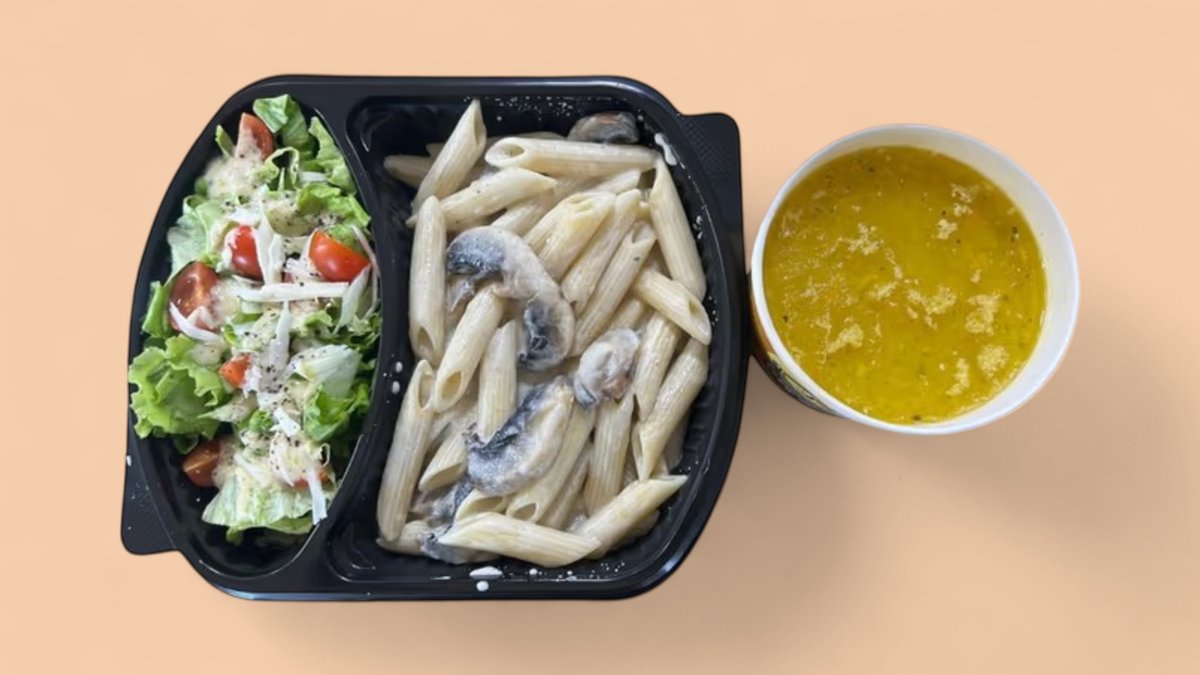Pene me pana & kërpudhë, sallatë çezar, supë pule