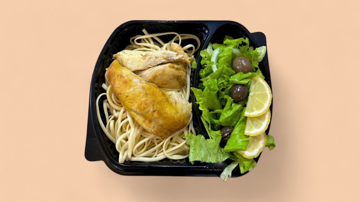 Linguini me gjalpë bio, fileto pule, sallatë jeshile