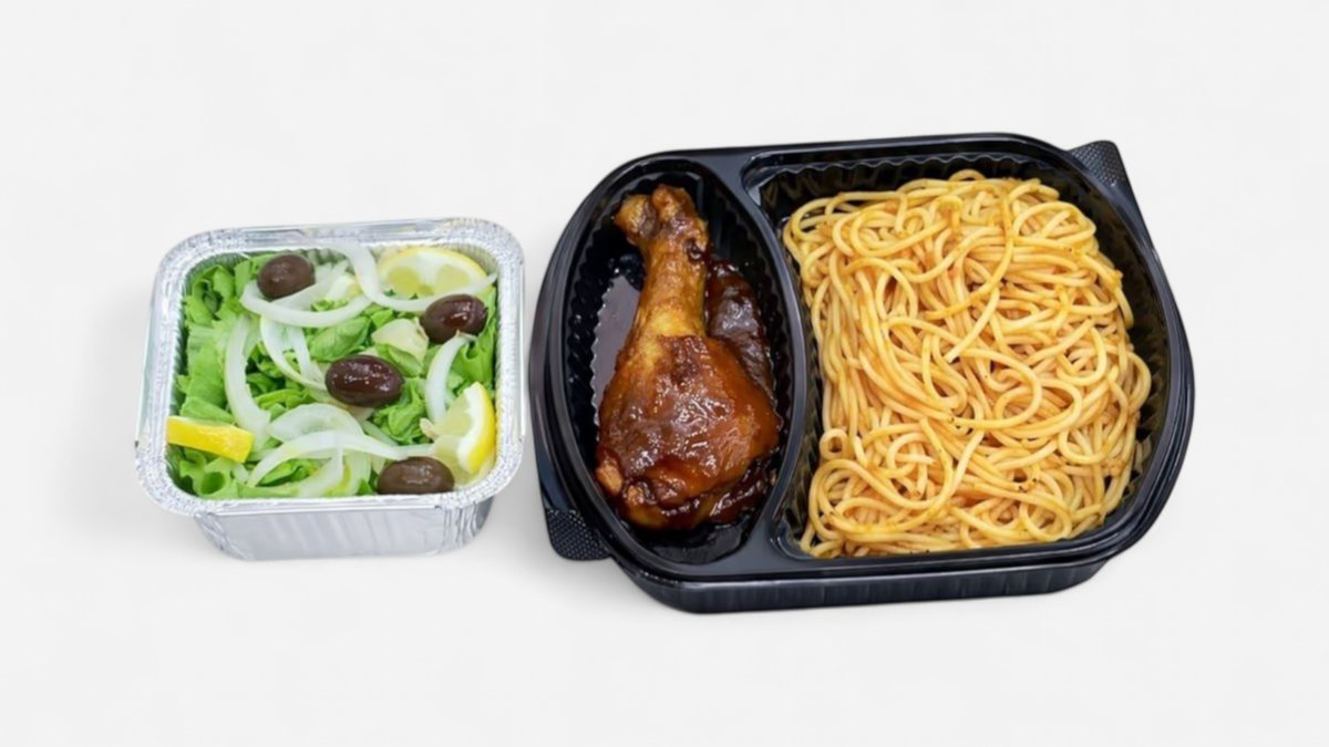 Kofsh Pule me Salc BBQ , Sphagetti me Salc Domate , Sallat Jeshile