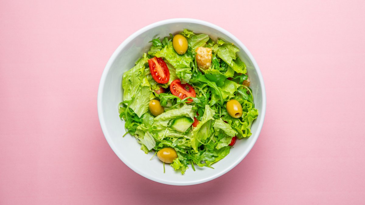 Sallatë jeshile, qepë, pomodorini, ullinj, sallator, copa buke