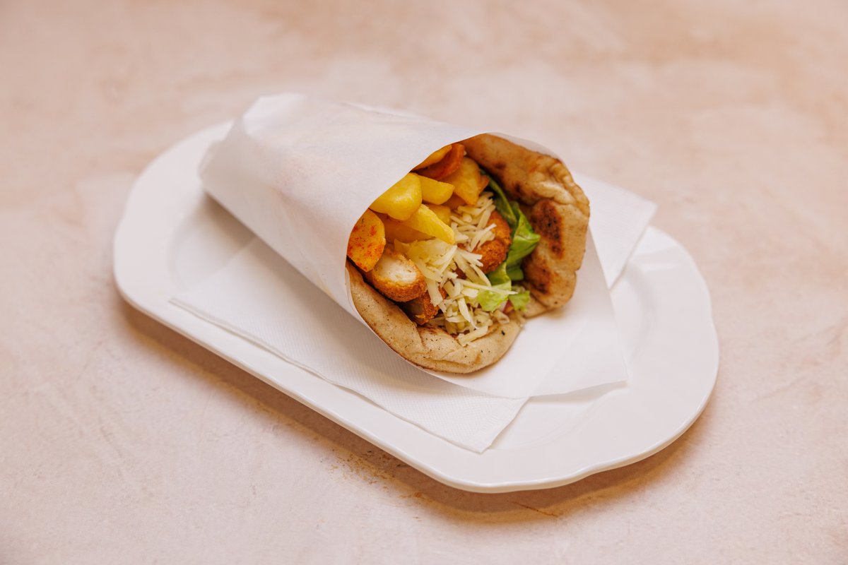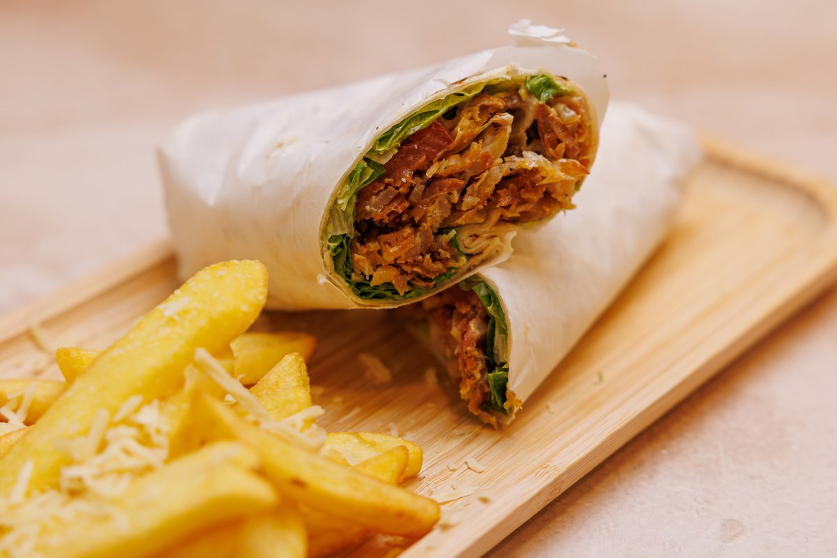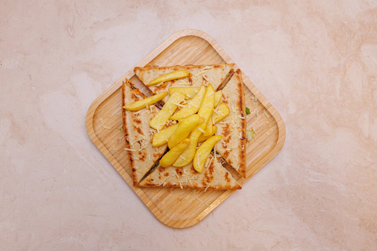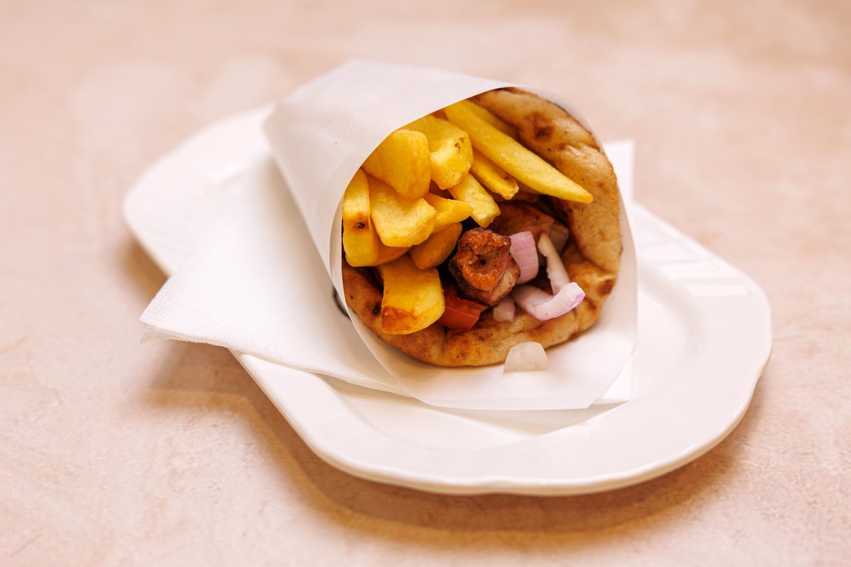 Pita, sos, mustard, domate, qepë, patate
