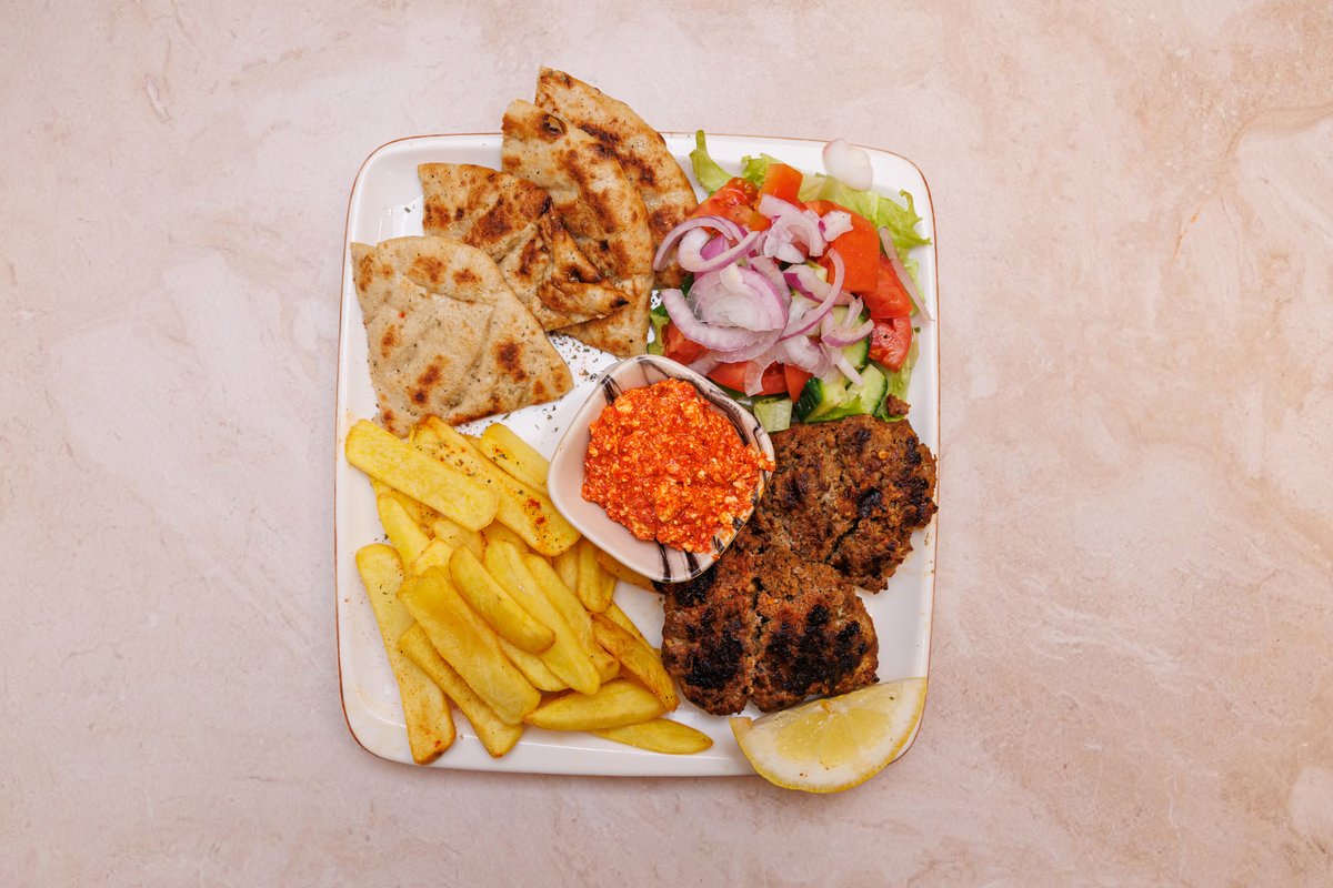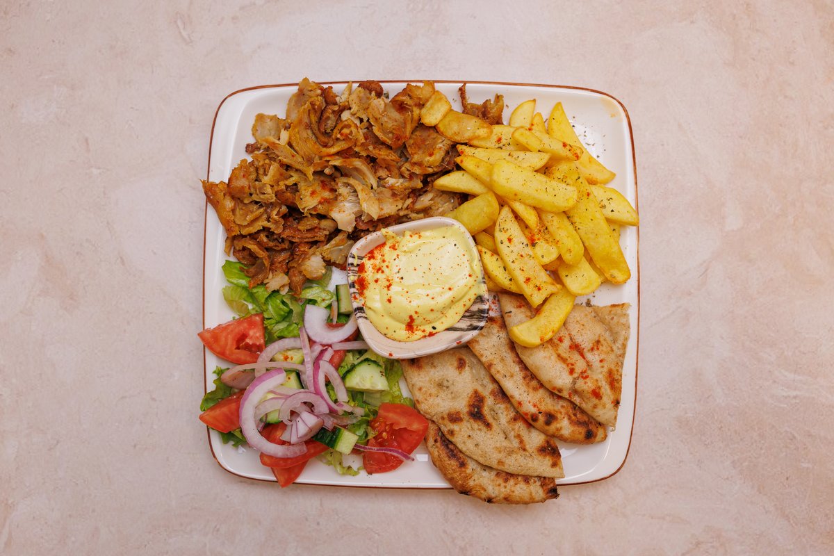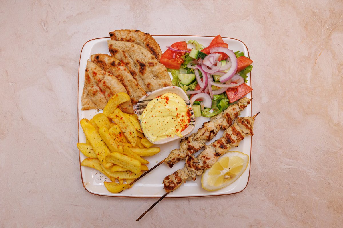 2 prsona, 2 pite, tzatziki, sos, gjiro pule ose derri, 2 qofte, shishqebap pule ose derri, 2 fileto pule