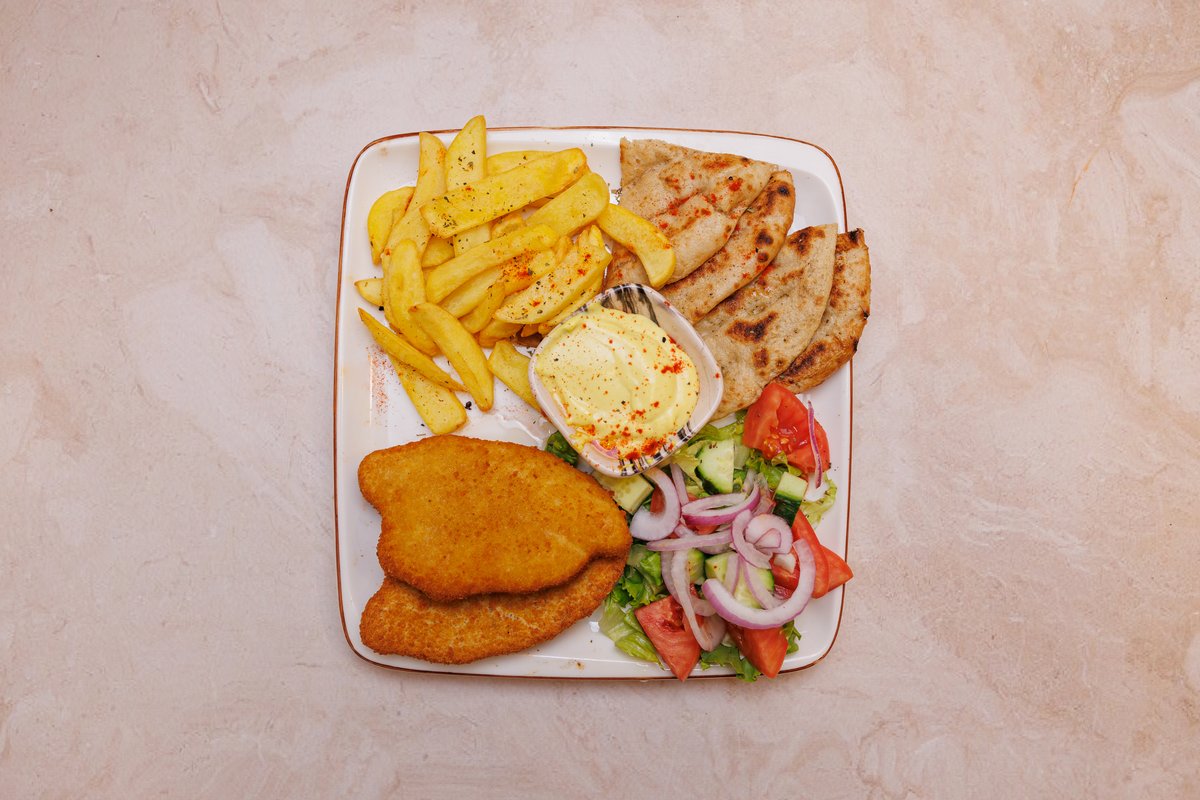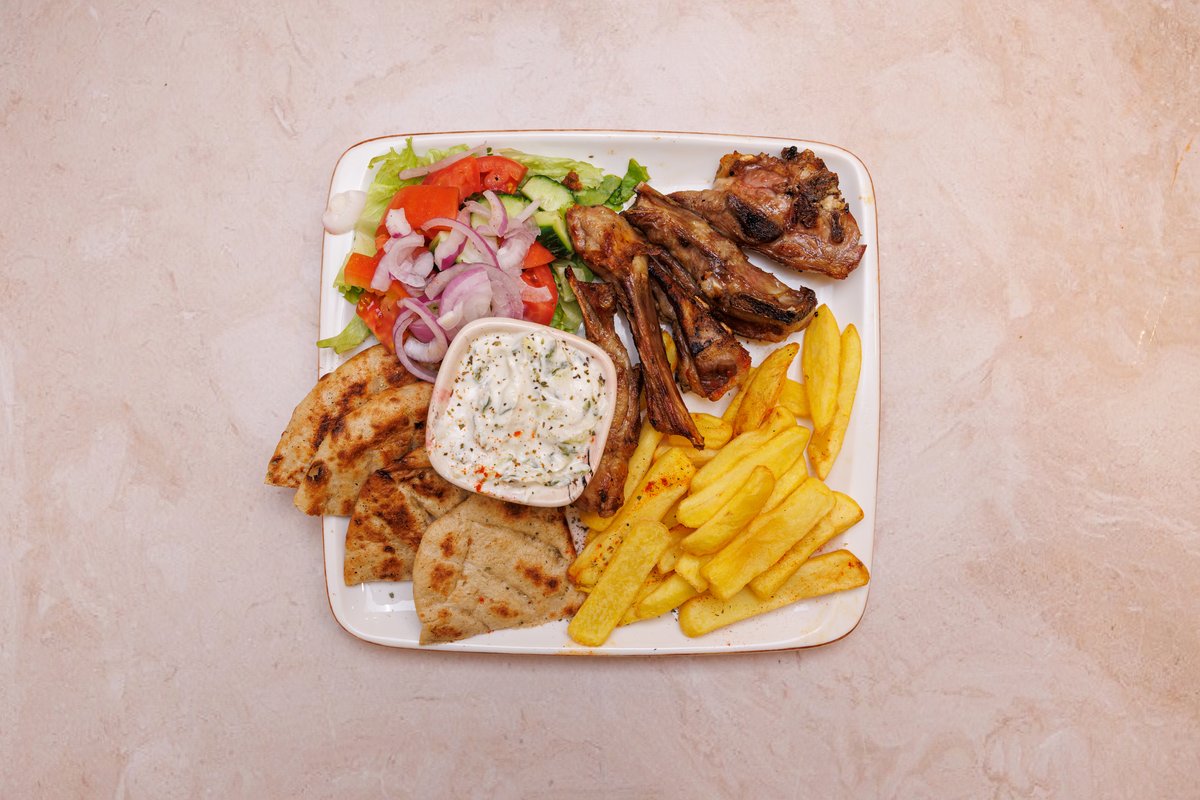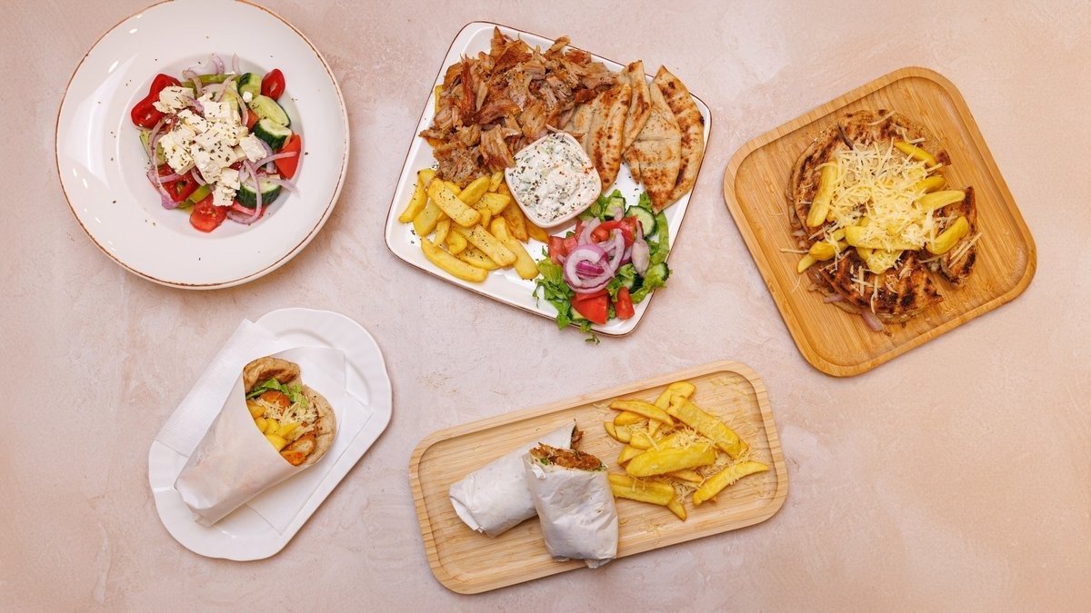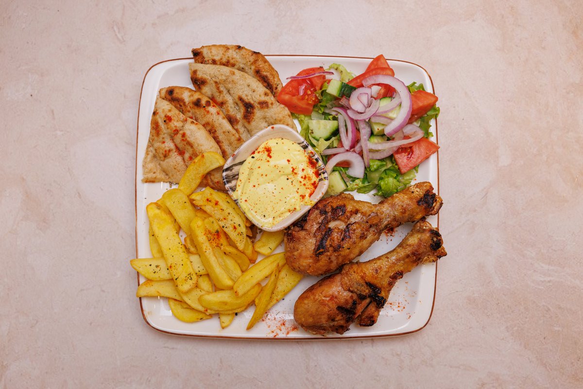 2 prsona, 2 pite, tzatziki, sos, gjiro pule ose derri, 2 qofte, shishqebap pule ose derri, 2 fileto pule