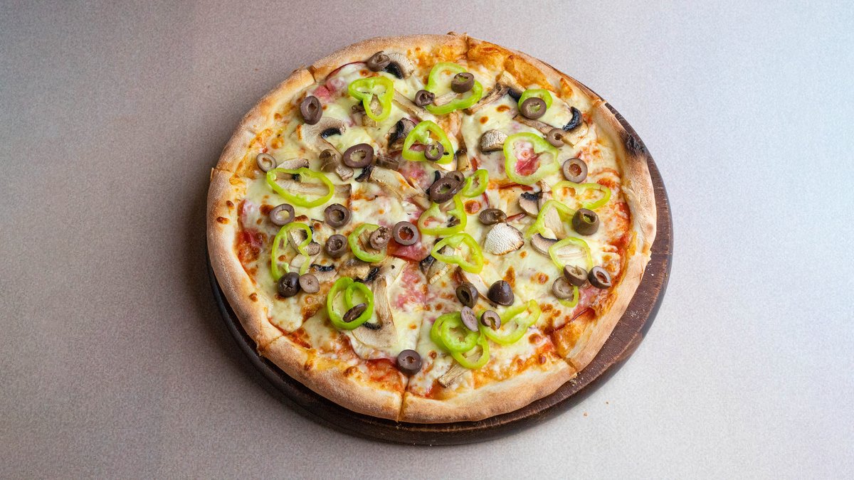 Salcë, mozzarella, kërpudha, proshutë, speca, ullinj