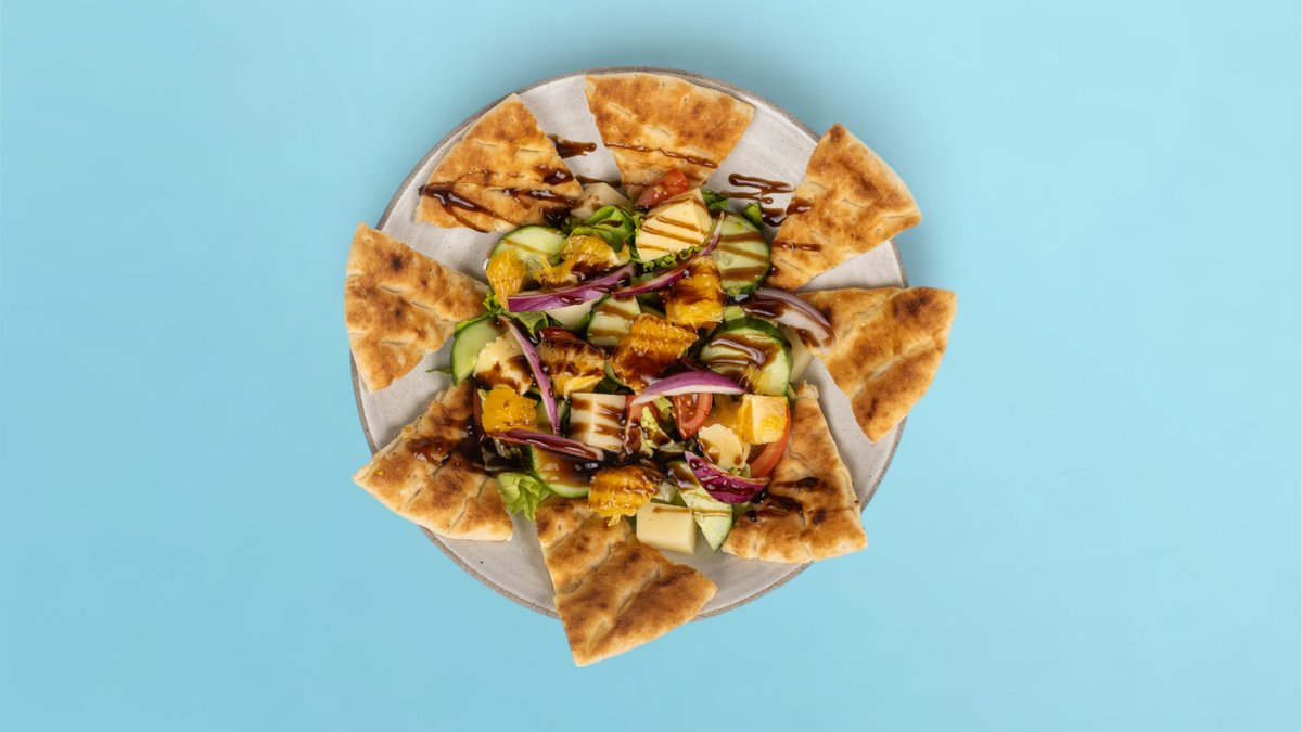 Sallatë domate, kastravec, qepë e kuqe, cilexhine, portokall, djathë graviera, krem balsam fiku