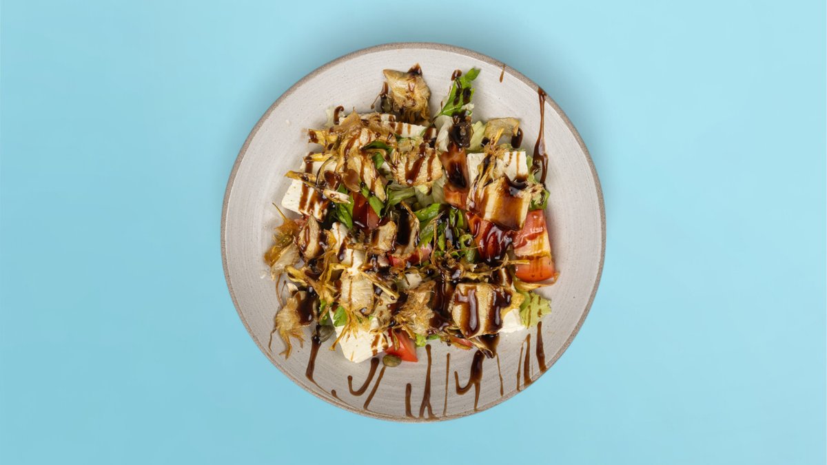 Sallatë miks, argjinare friturë, feta cilexhine, krem balsam fiku, mente e freskët