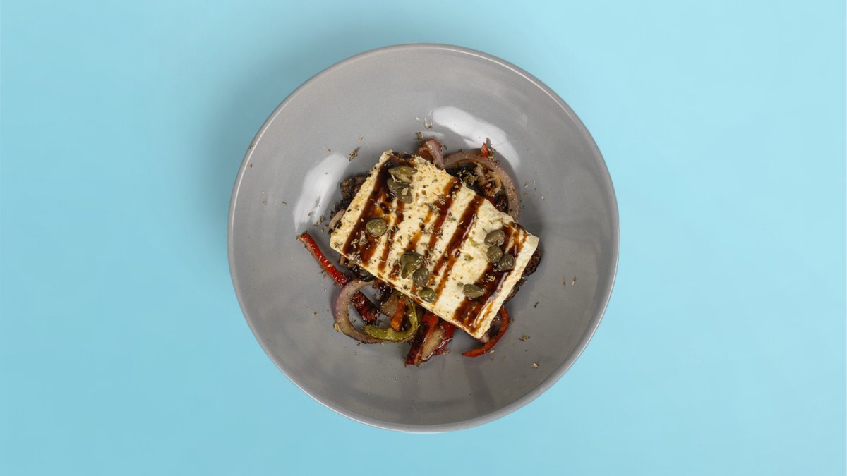 Djathë feta në furrë, cilexhine, qepë, ulinj, rigon, majdanoz