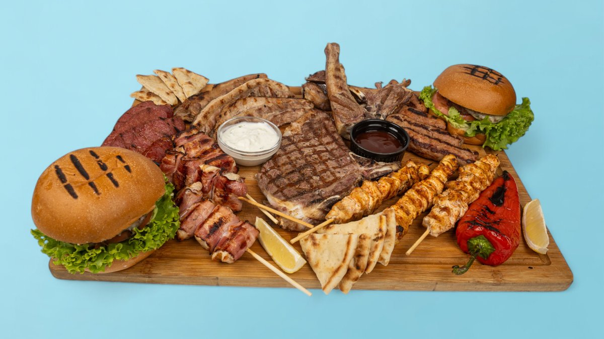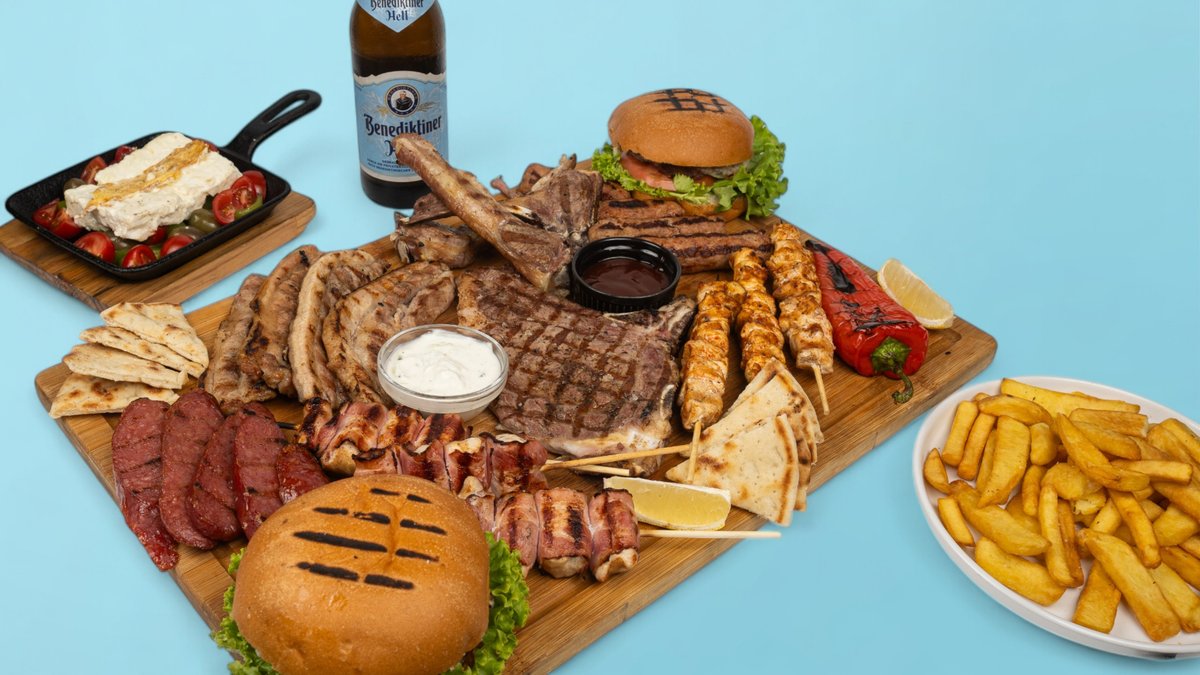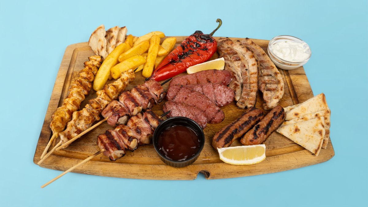 Bërxollë viçi, brinjë qingji, paidhaqe gici të buta, shishqebap pule, shishqebap pule të mbështjella me proshutë, dy burger me qofte viçi, qofte gici të shtëpisë, llukanik i pjekur, patate të skuqura, pite, salcë xaxiq e freskët