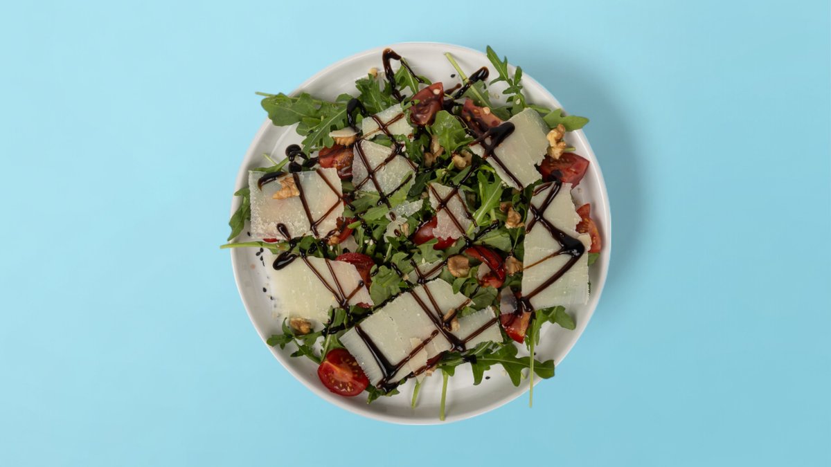 Rukola e fresket, fara susami te bardha dhe te zeza, domate të vogla, arra, aceto balsamike dhe copeza djathi parmigiano