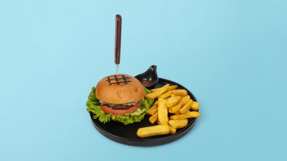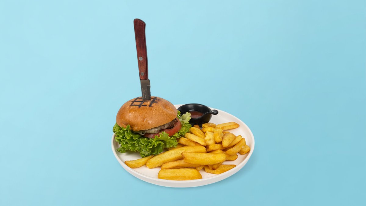 Qofte viçi e freskët, bejkon krokant, djathë Amerlander, perime të freskëta, salcë sekete e shtëpisë, shoqëruar me patate