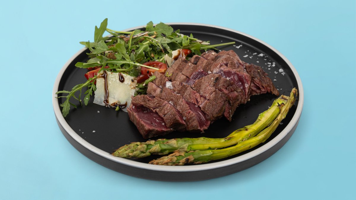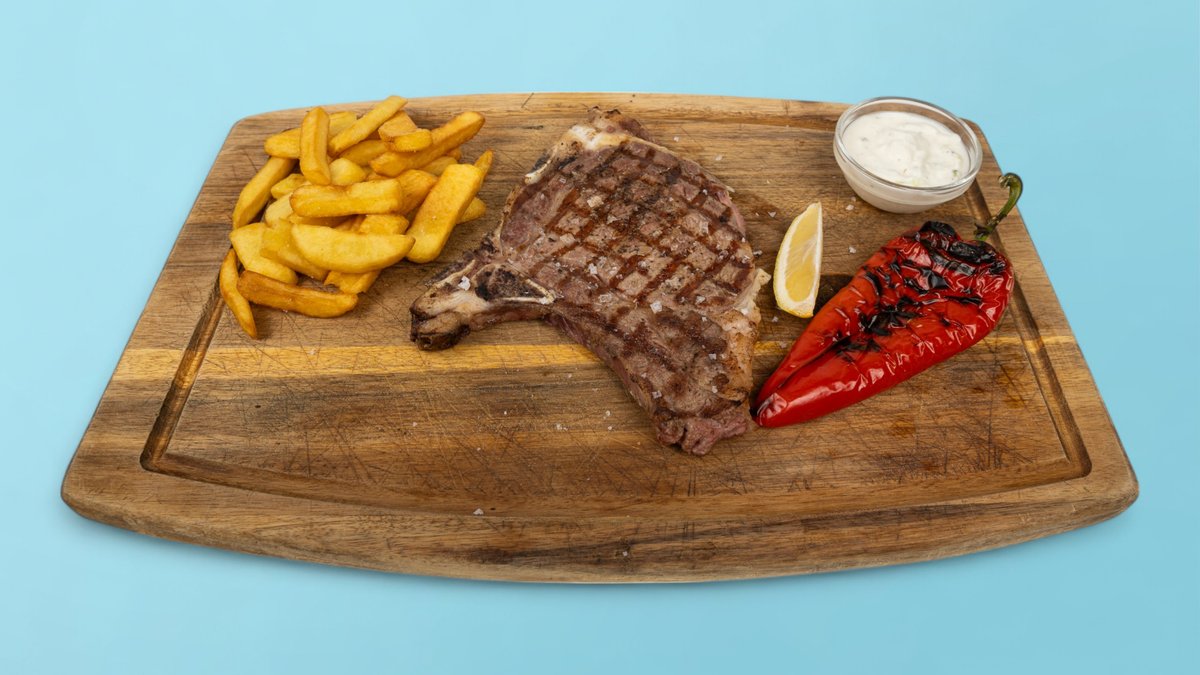 Bërxollë viçi e pjekur në skarë me kujdes, shoqërohet me perime të freskëta, patate të skuqura & salcë xaxiq e freskët