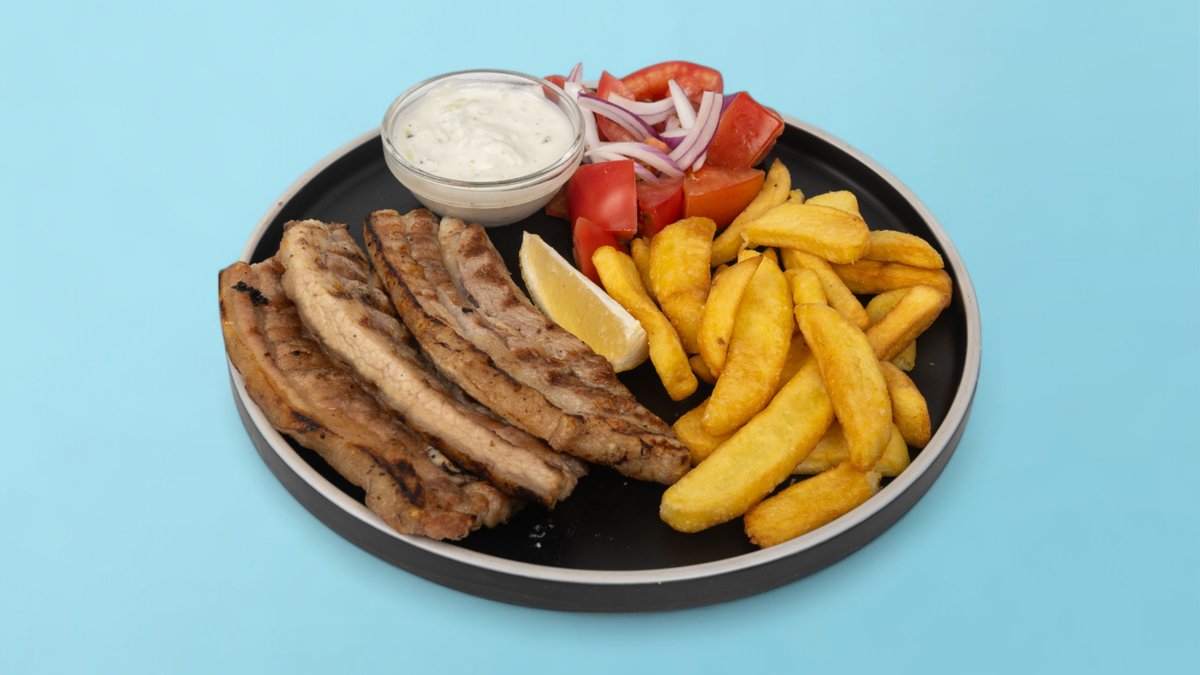 Brinjë qengji të zgjedhura, të marinuara me erëza të freskëta, shoqërohen me domate, qepë, patate të skuqura & salcë xaxiq e freskët