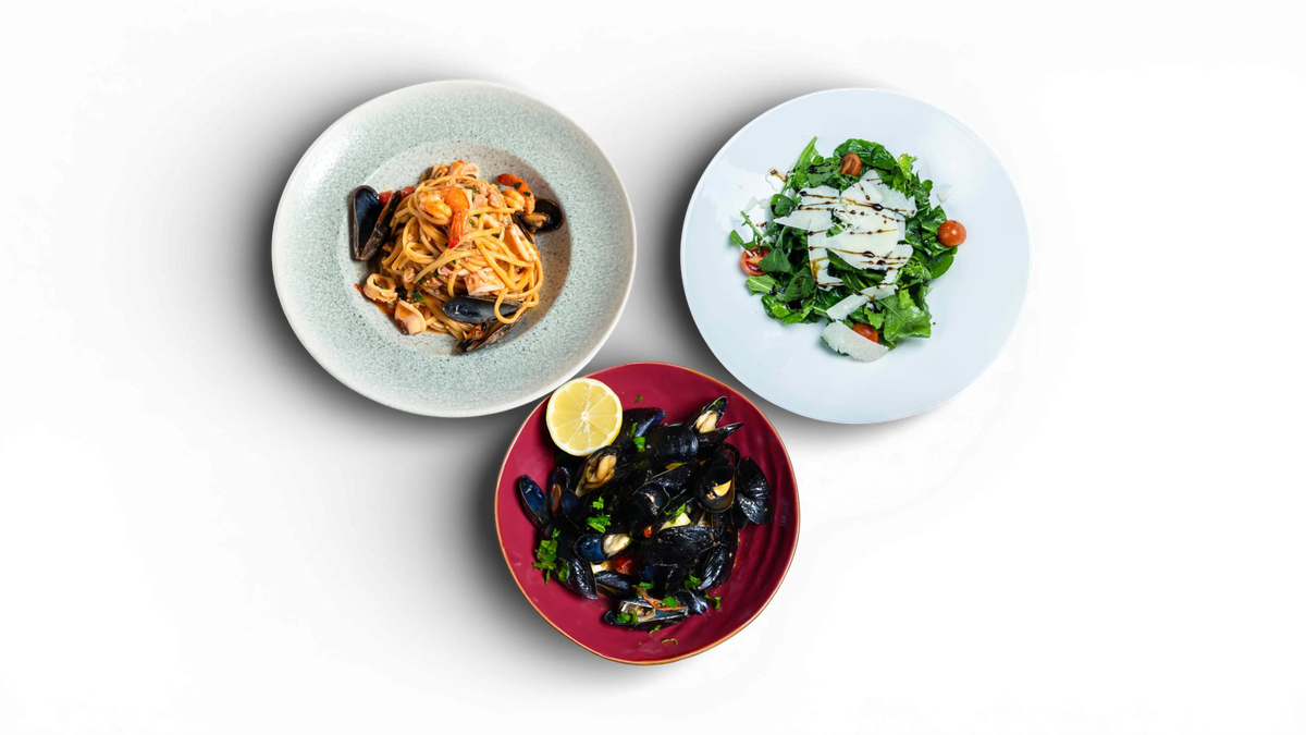 Sallatë rukola, midhje sote, linguine fruta deti