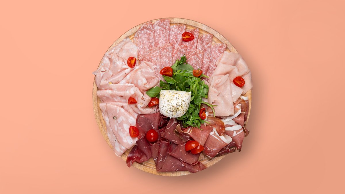 Bufalo, proshutë e papjekur, proshutë e gatuar, bresaola, spek, rukola, domate qershie