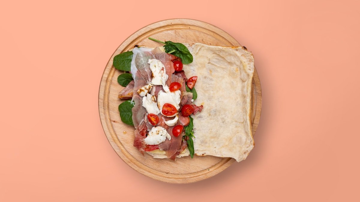 Domate, mocarela, proshutë e papjekur, rukola, domate qershie