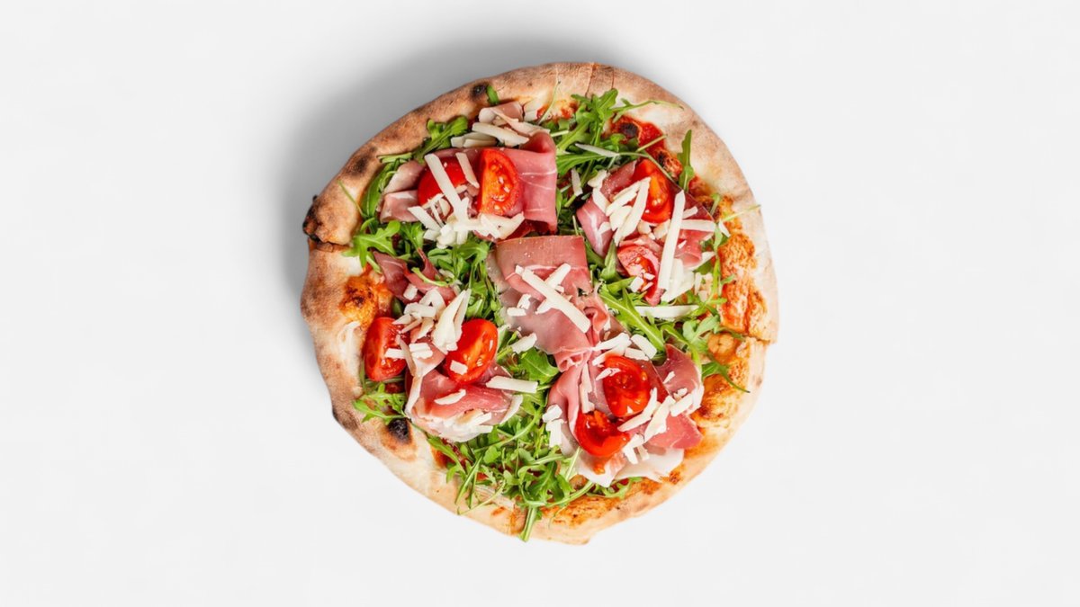 Salcë domatesh e shtëpisë, mozzarella, prosciutto crudo, rukola, grana, domate