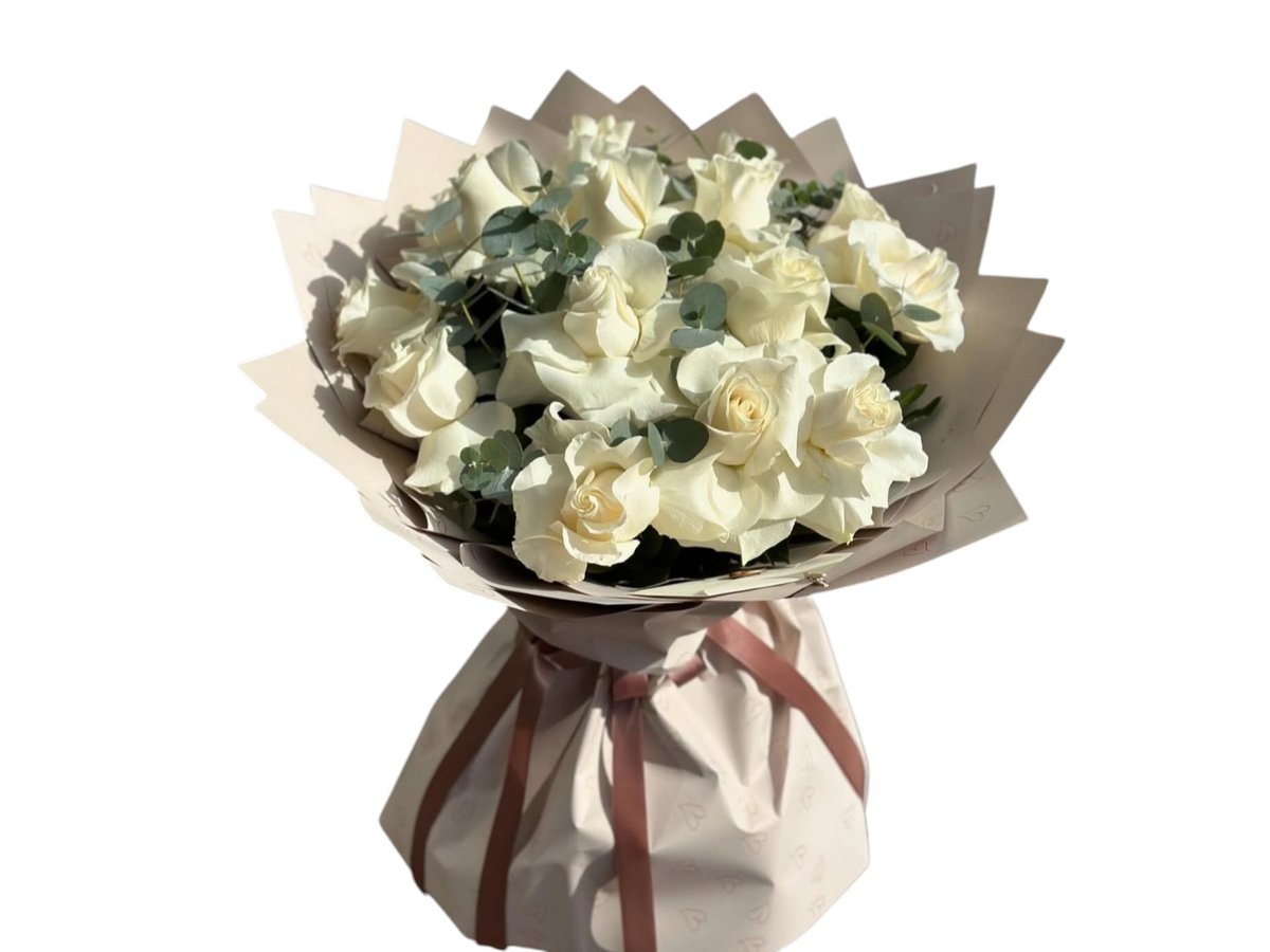 Buqete Me 15 Trendafila Te Bardhe Dhe Equalipt