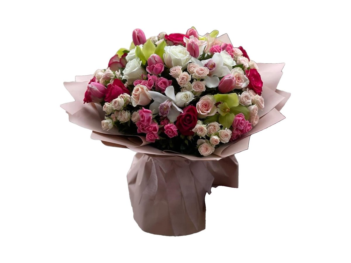 Buqete Me Roselini, Tulipan, Liziantus, Cimbidium, Trendafila