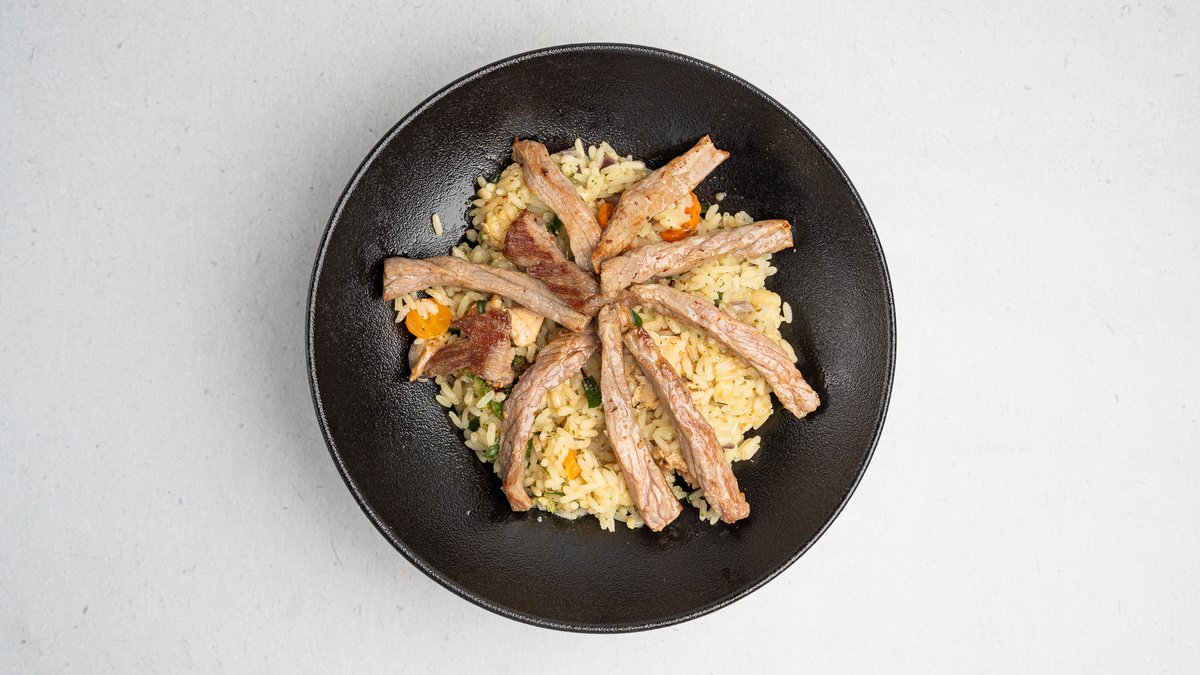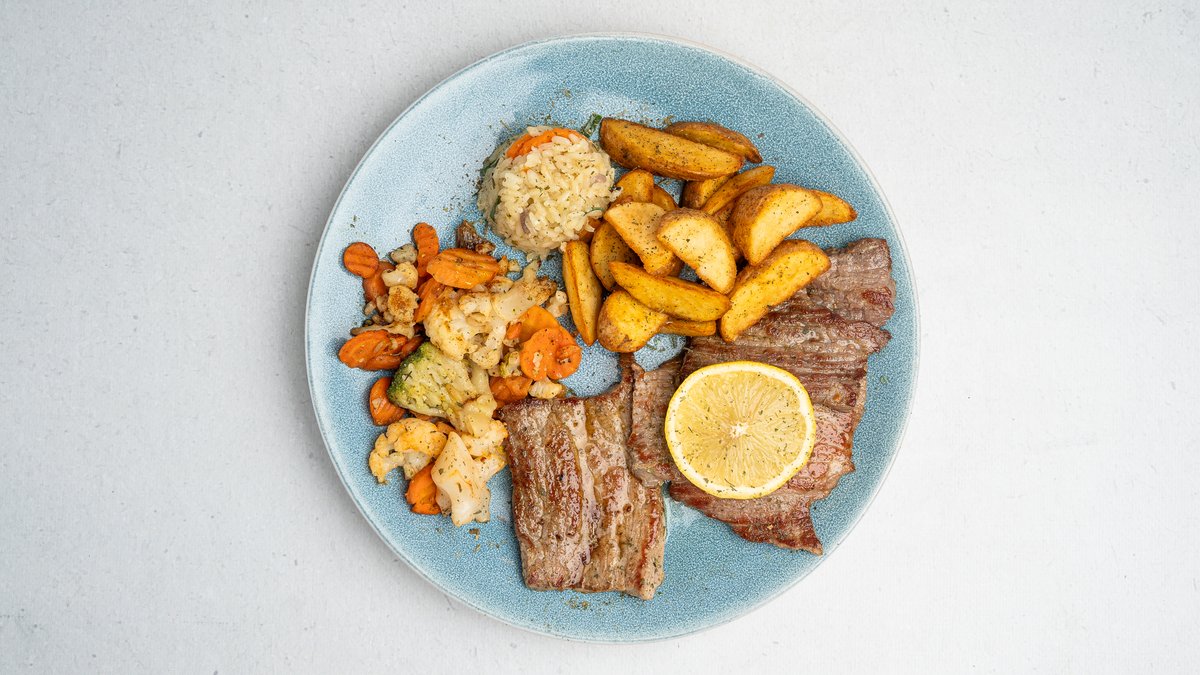 Sos kërpudhash, oriz, perime, patatina