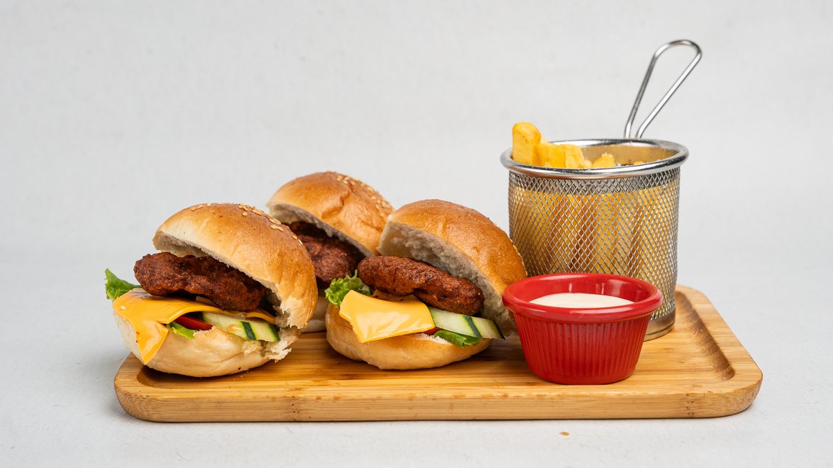 3 Burgera të vegjël, domate, tranguj, american cheese, pomfrit, sos