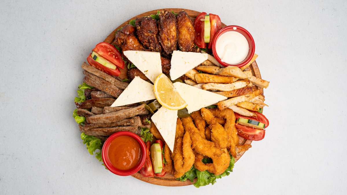 Wings, fingers, mish pule, mish viçi, patatina, djathë, tranguj turshi, 2 lloje sosash