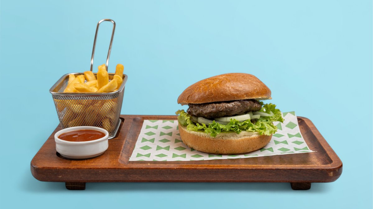 Burger viçi i pjekur, kaçkavall i shkrirë, qepë, marullë, tranguj turshi, patate të skuqura